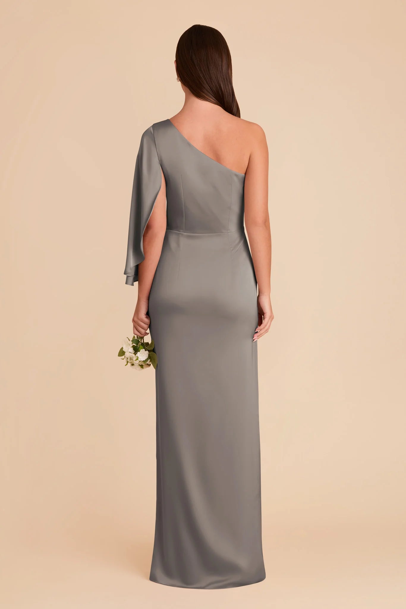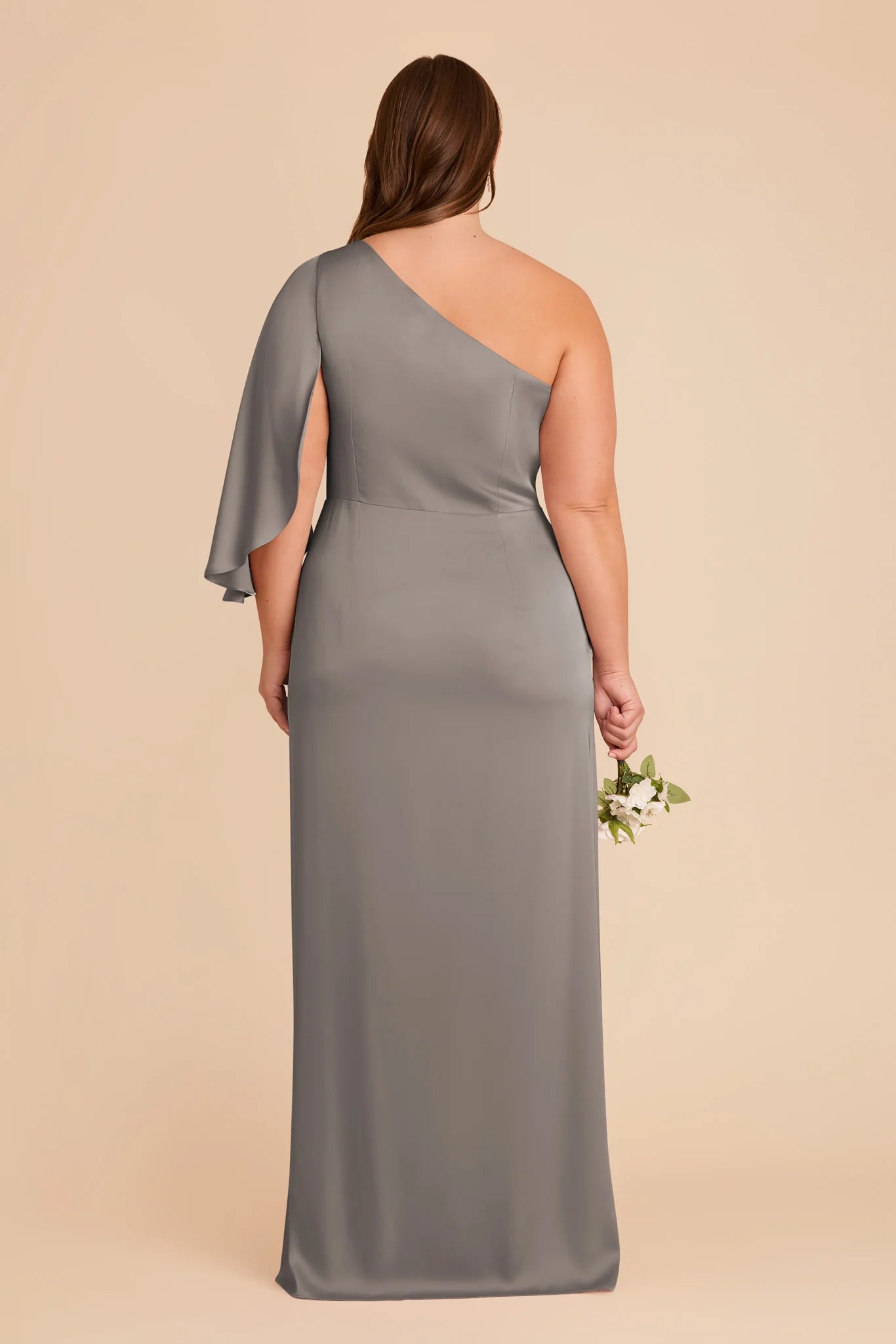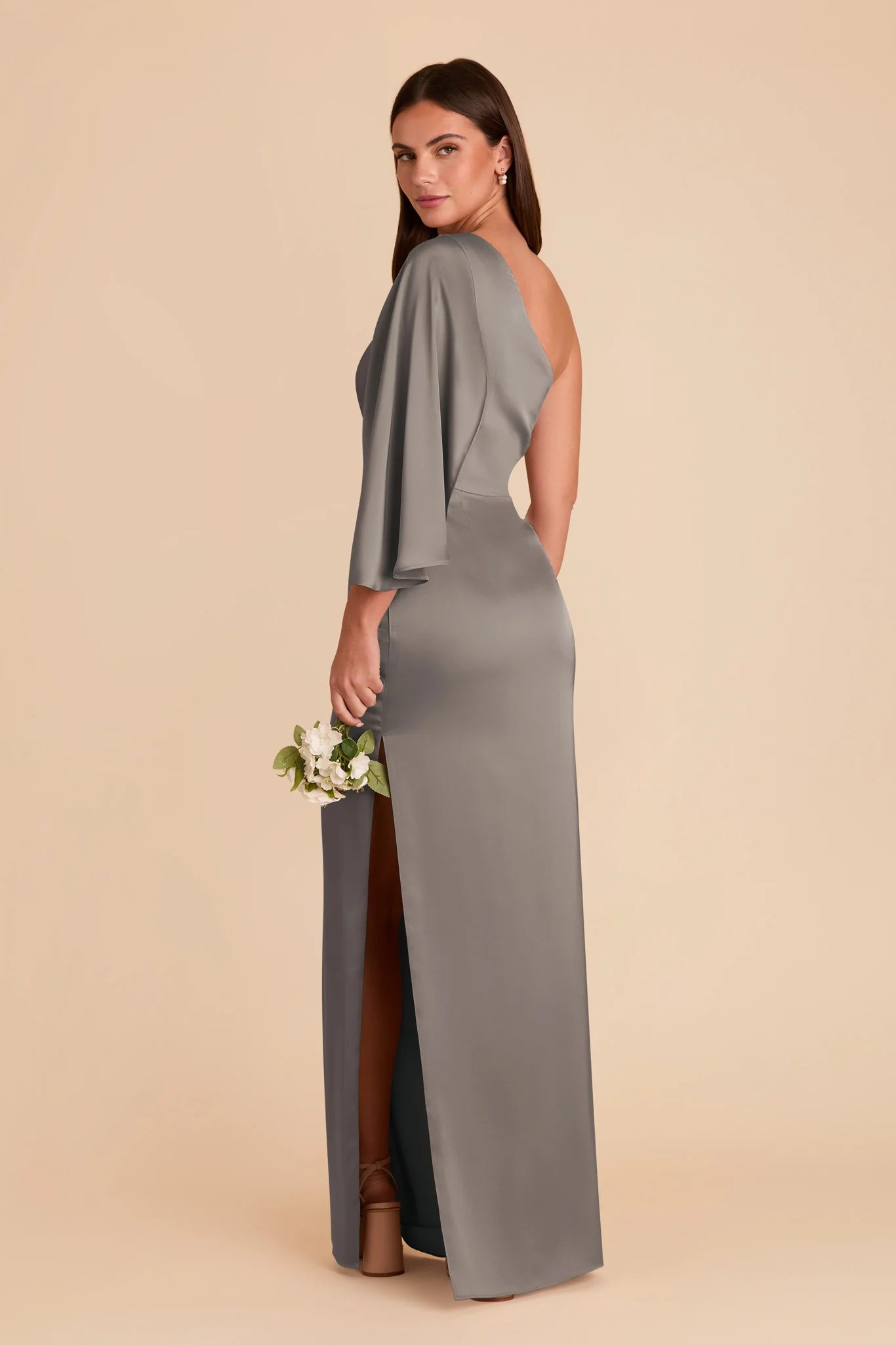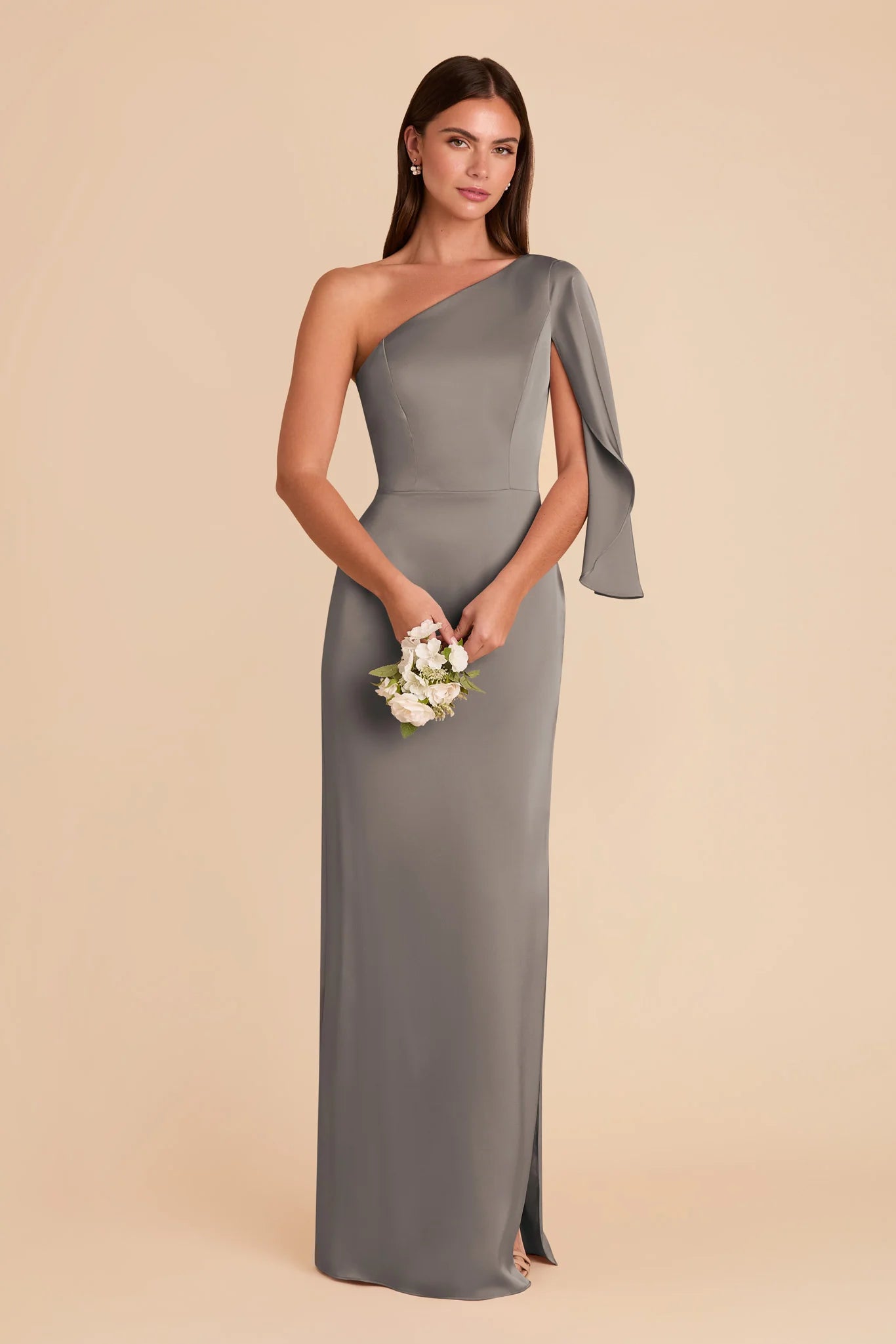 A graceful shoulder overlay adds a dramatic flair to this one-shoulder gown.