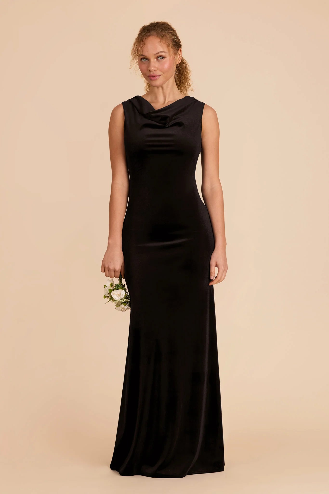 Elevate your look with this body-skimming, ruched velvet gown, complete with a cowl neck.