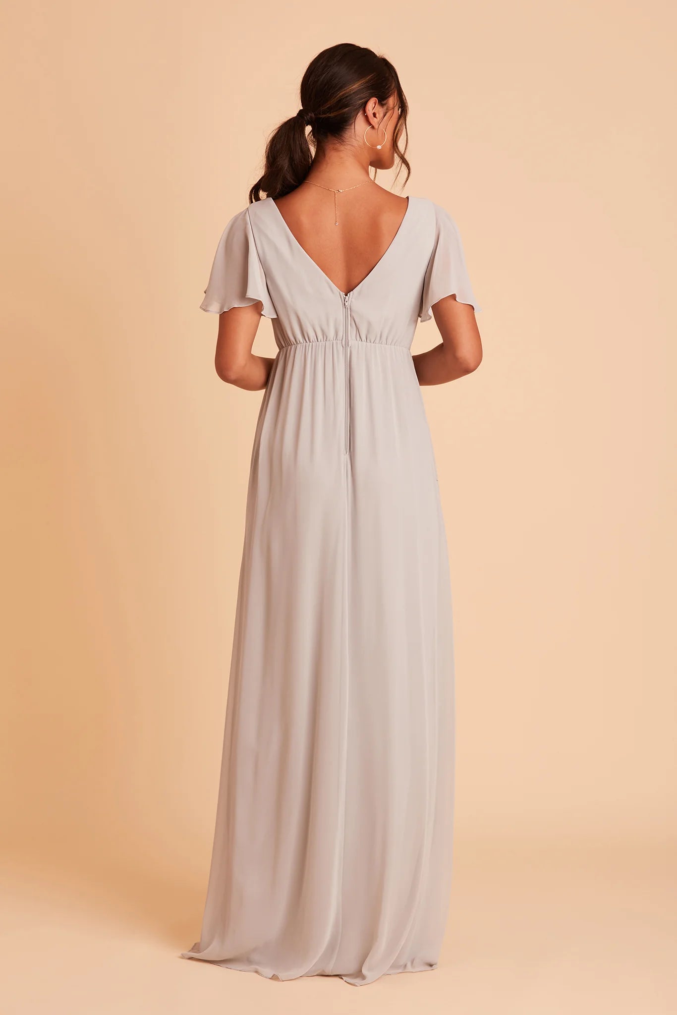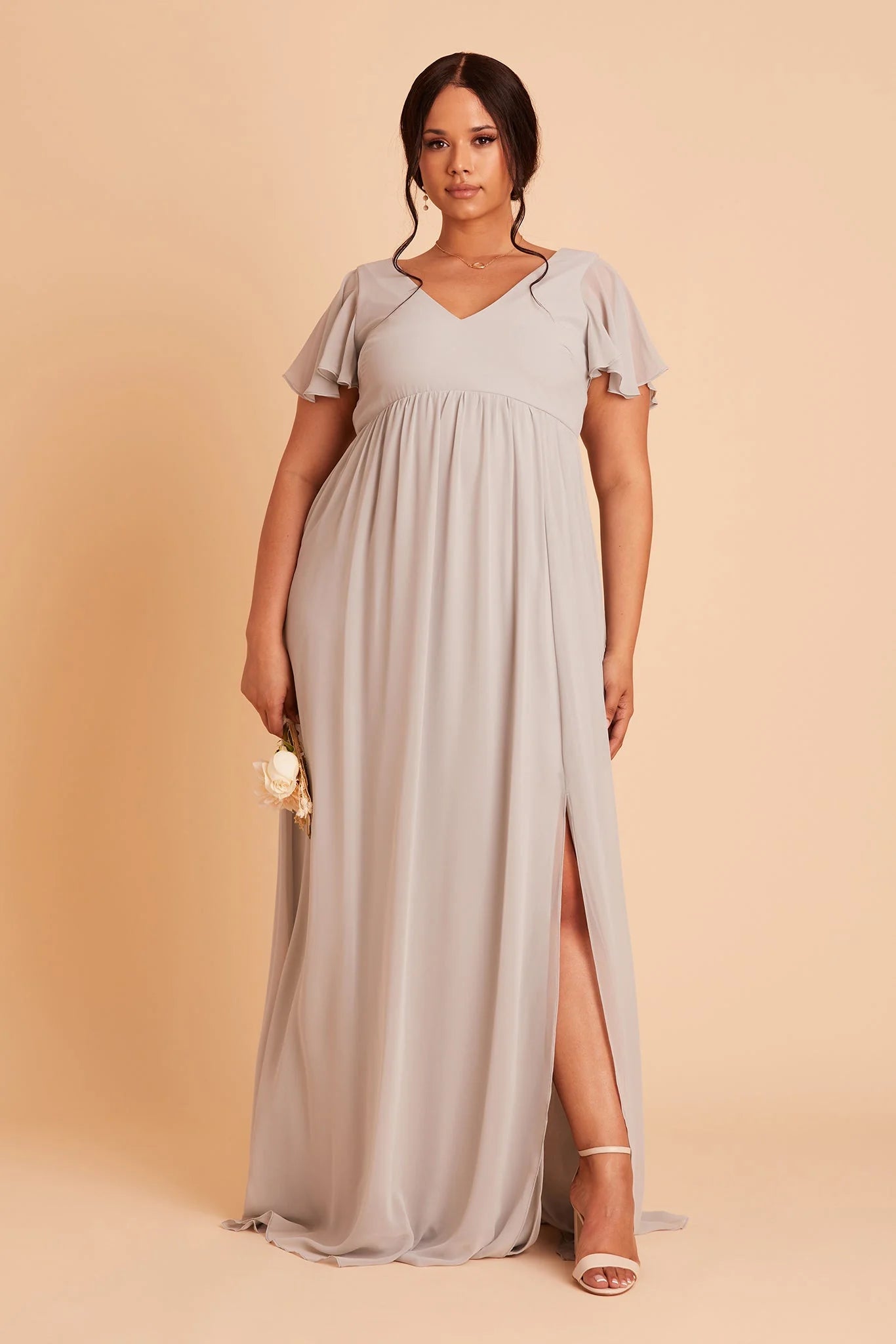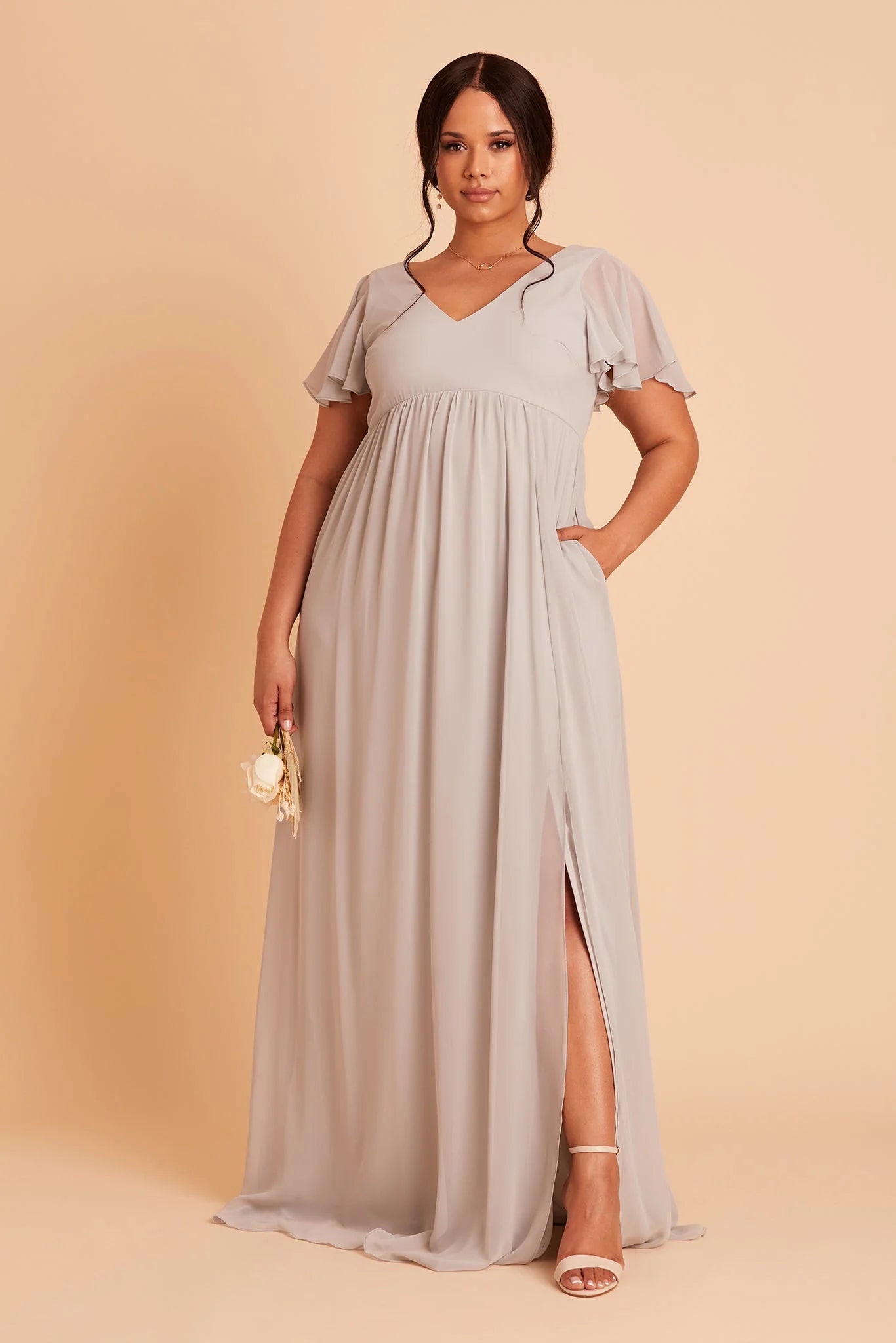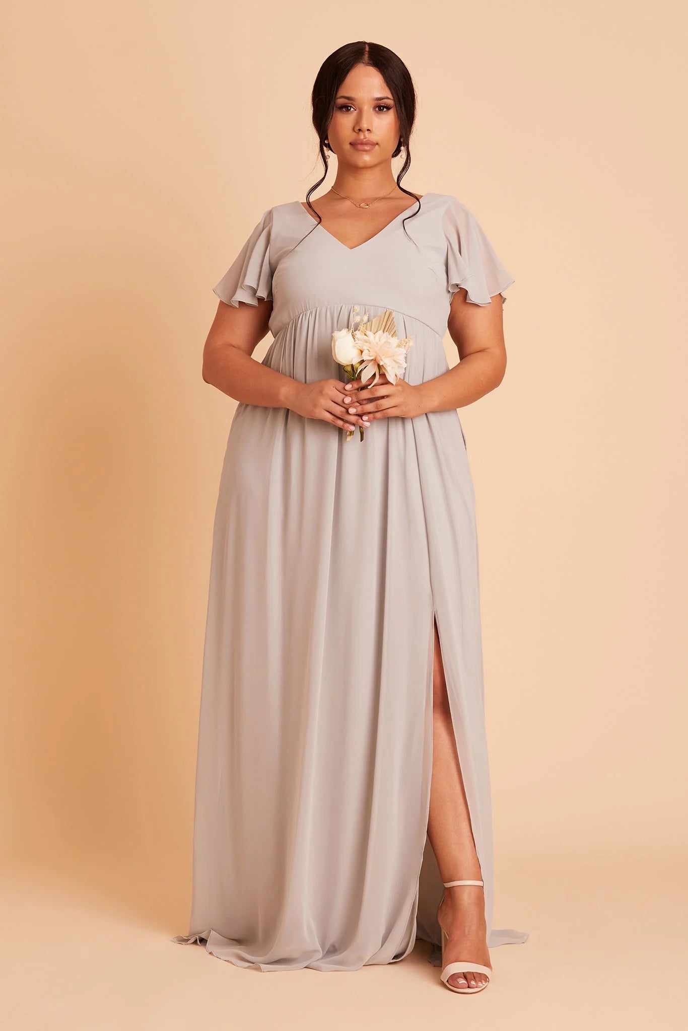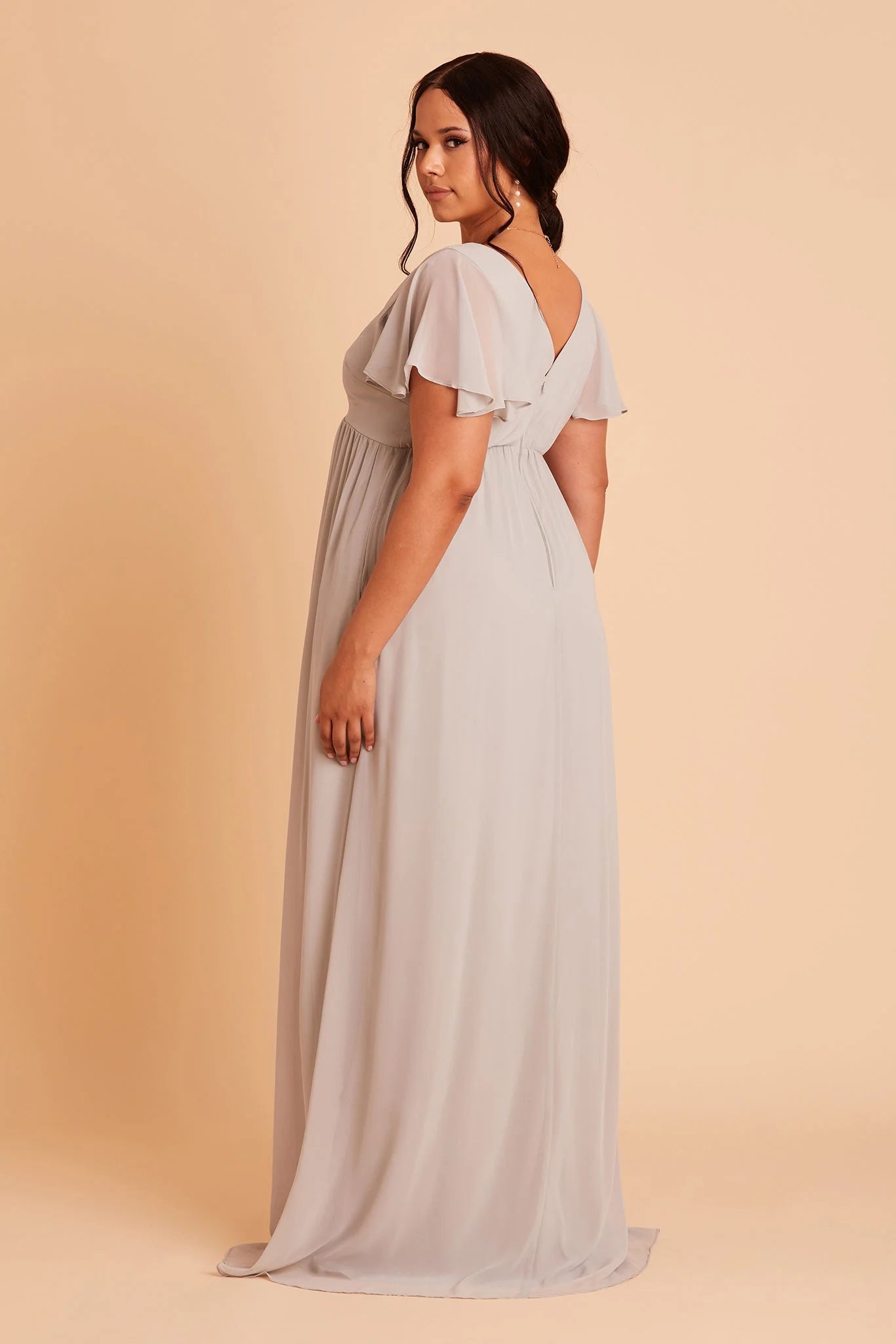 Whatever you need that extra wiggle room for—a baby bump, a second helping, extra cake, or if you simply prefer more breathing room, Hannah is the girl for you. Spun of lightweight chiffon, this dress won't ever weigh you down while floating down the aisle or getting down on the dancefloor (no one said a bump should keep you from having fun!). The key here is the raised empire waist fitted with a stretchy elastic that's especially great news for expecting moms. The flutter sleeves add a sweet touch while also offering comfy arm coverage.