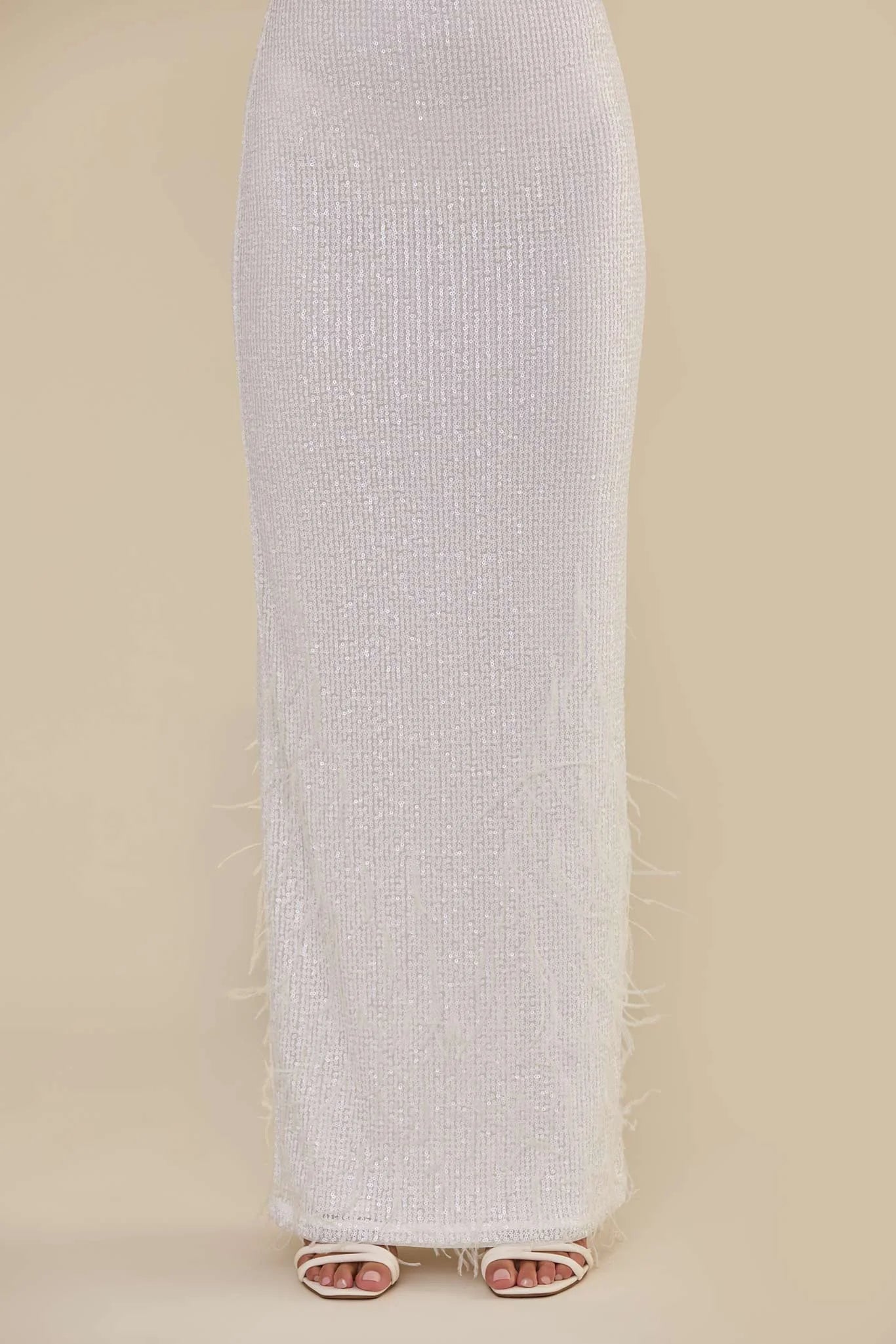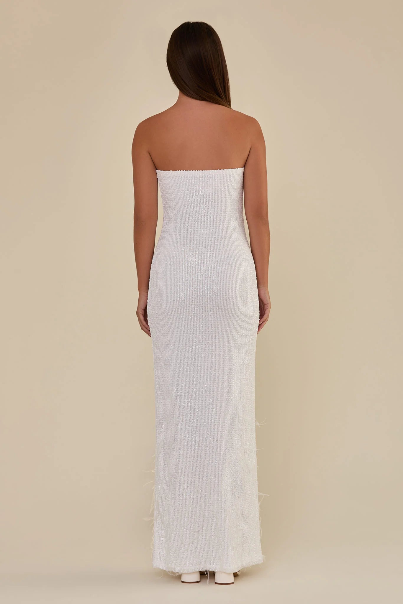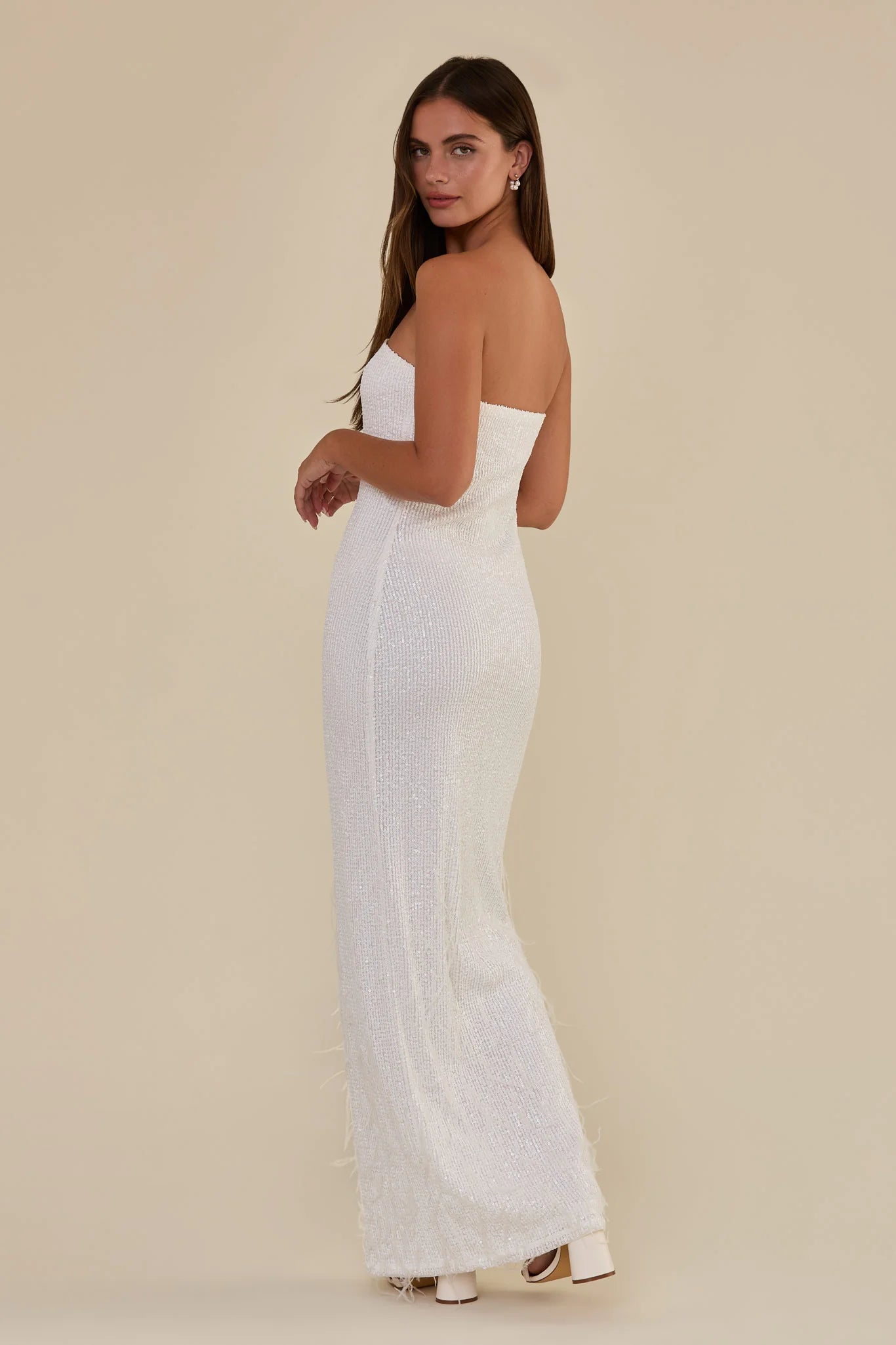 This white sequin dress with a gorgeous feather hem screams "life of the party!"
