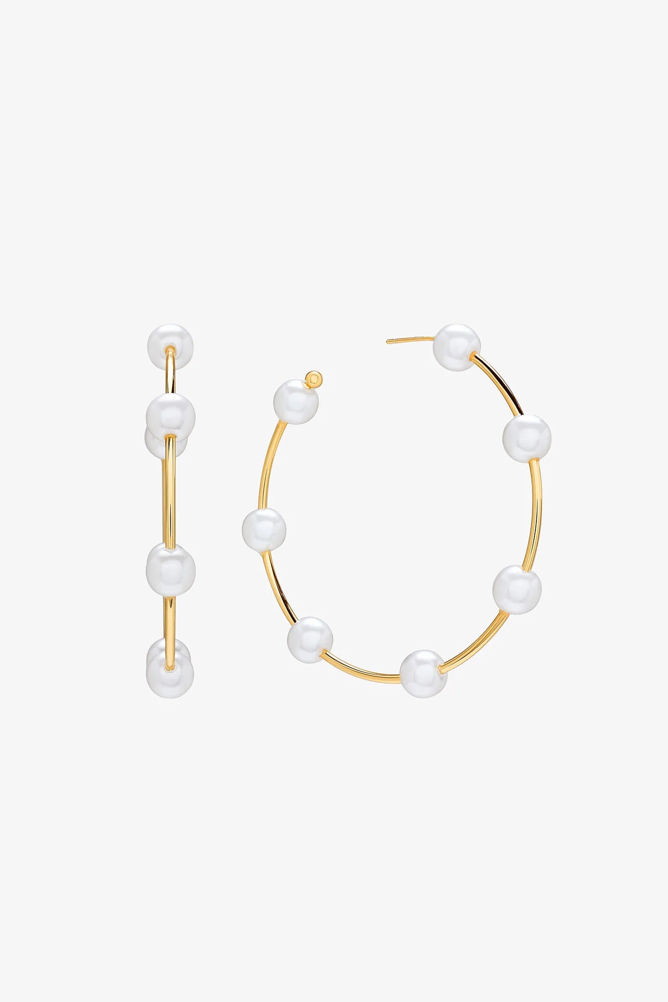 Turn heads from the bach to the after party in these stunning gold pearl hoop earrings.