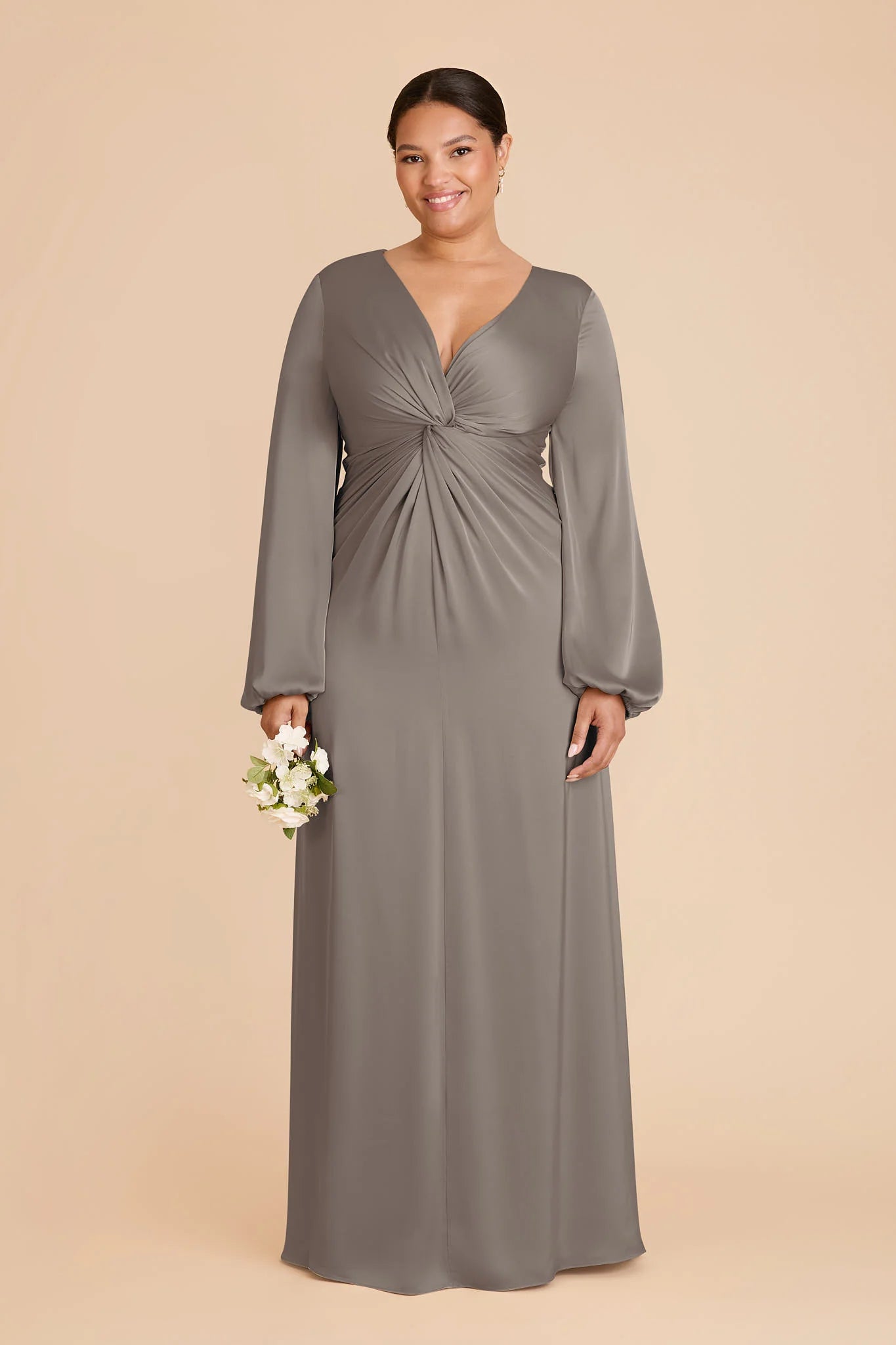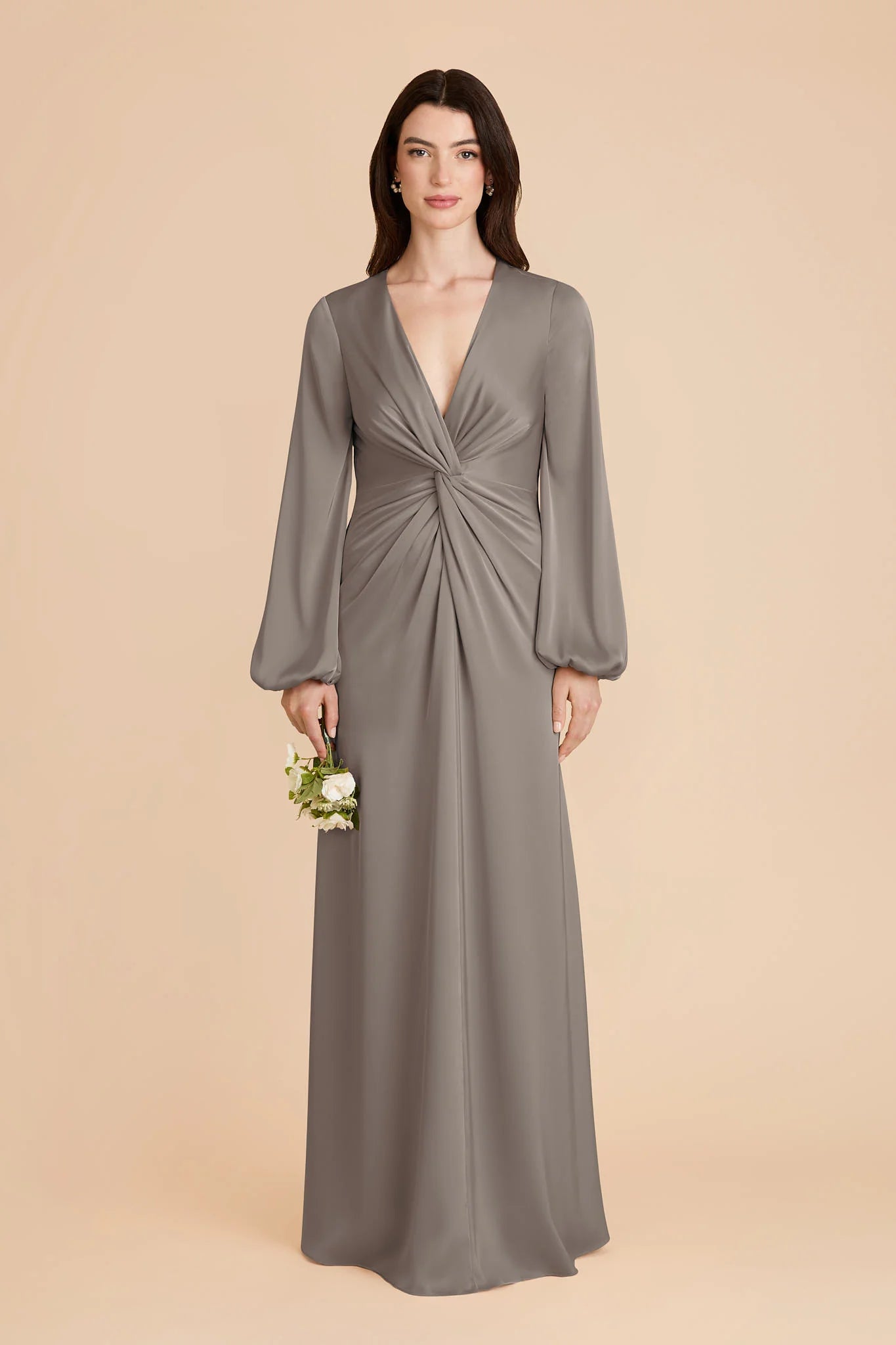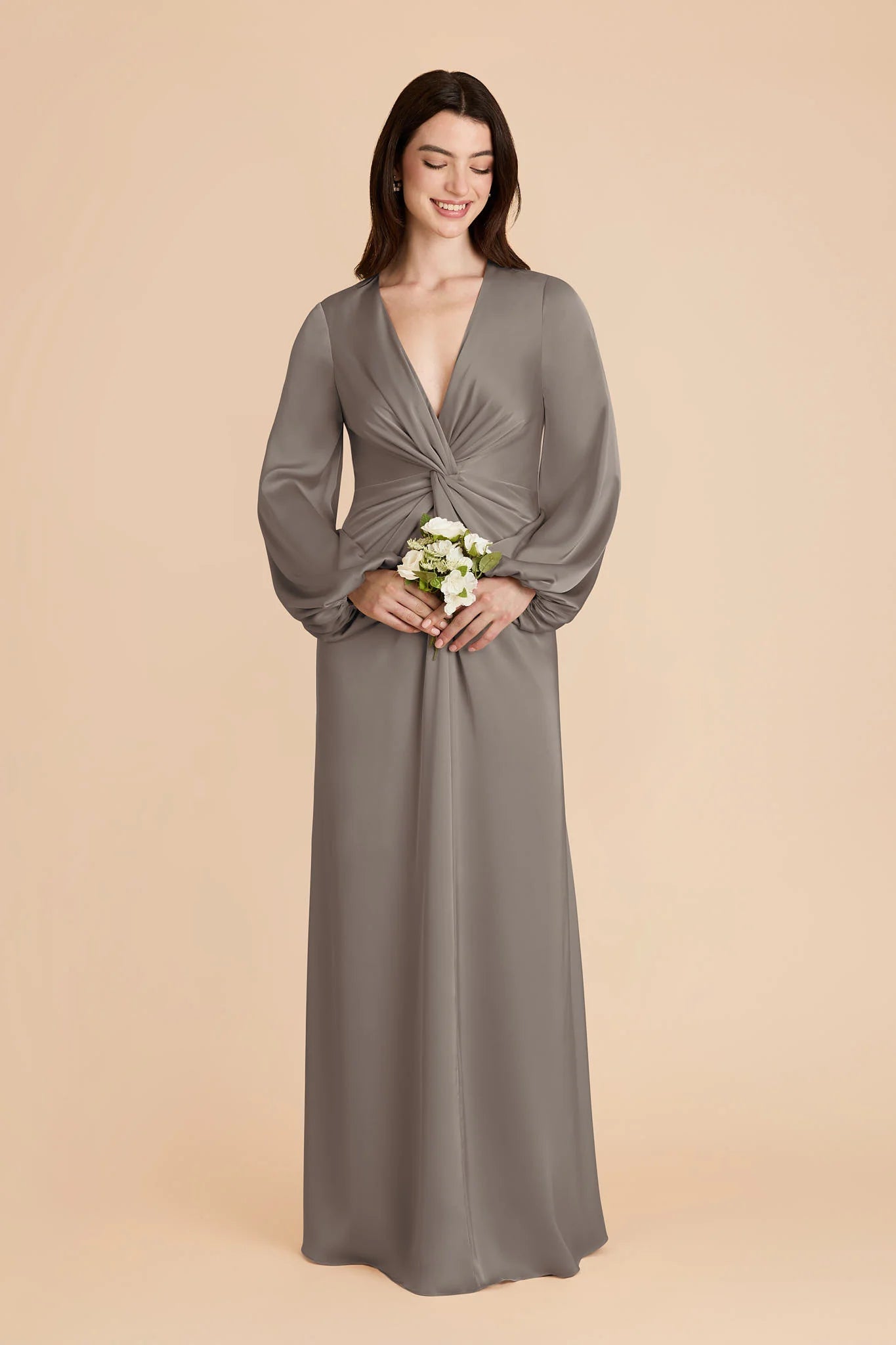 Make a statement in this long-sleeve, matte satin bridesmaid dress with a plunging V-neck, a flattering knotted waist.