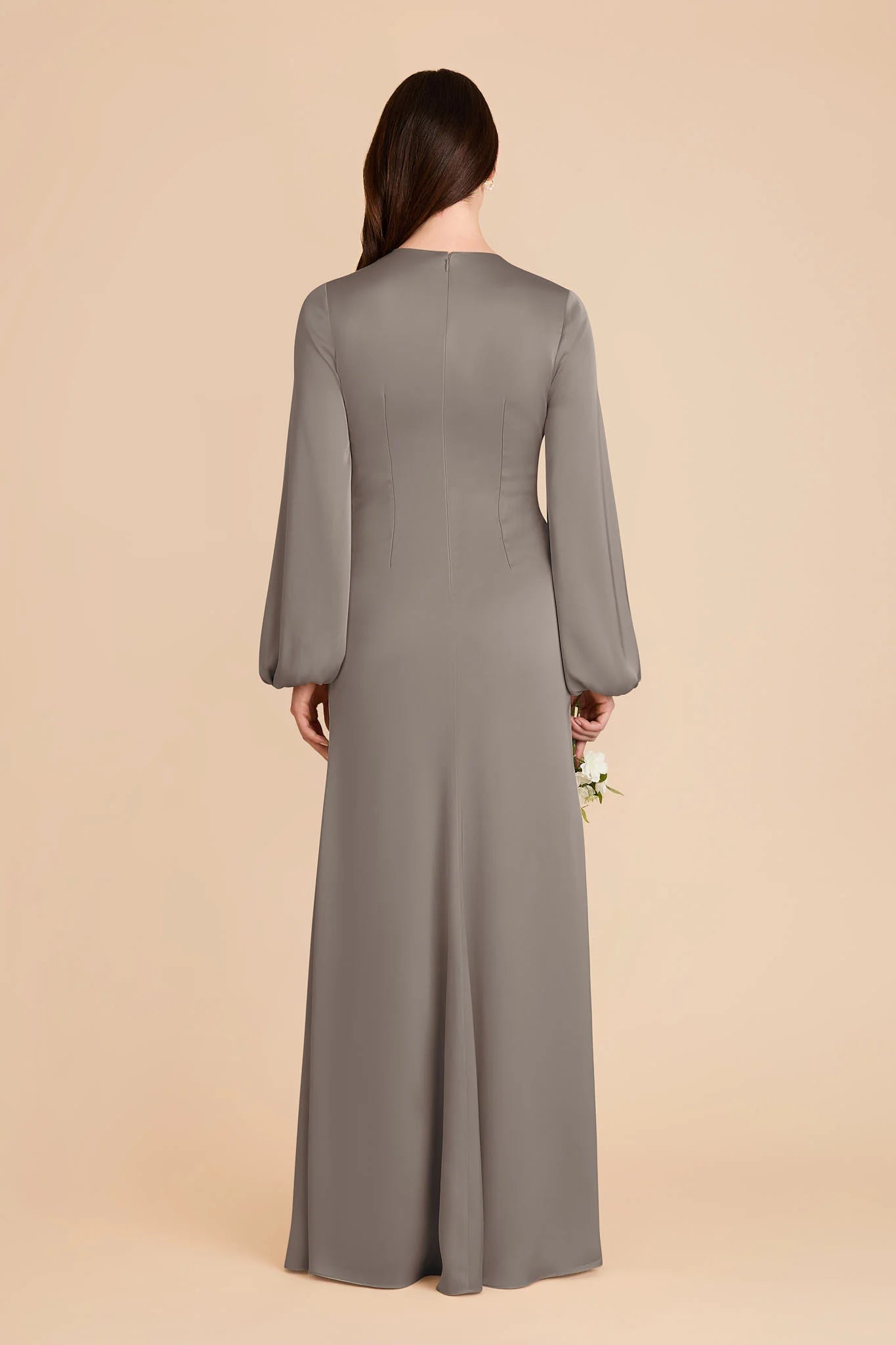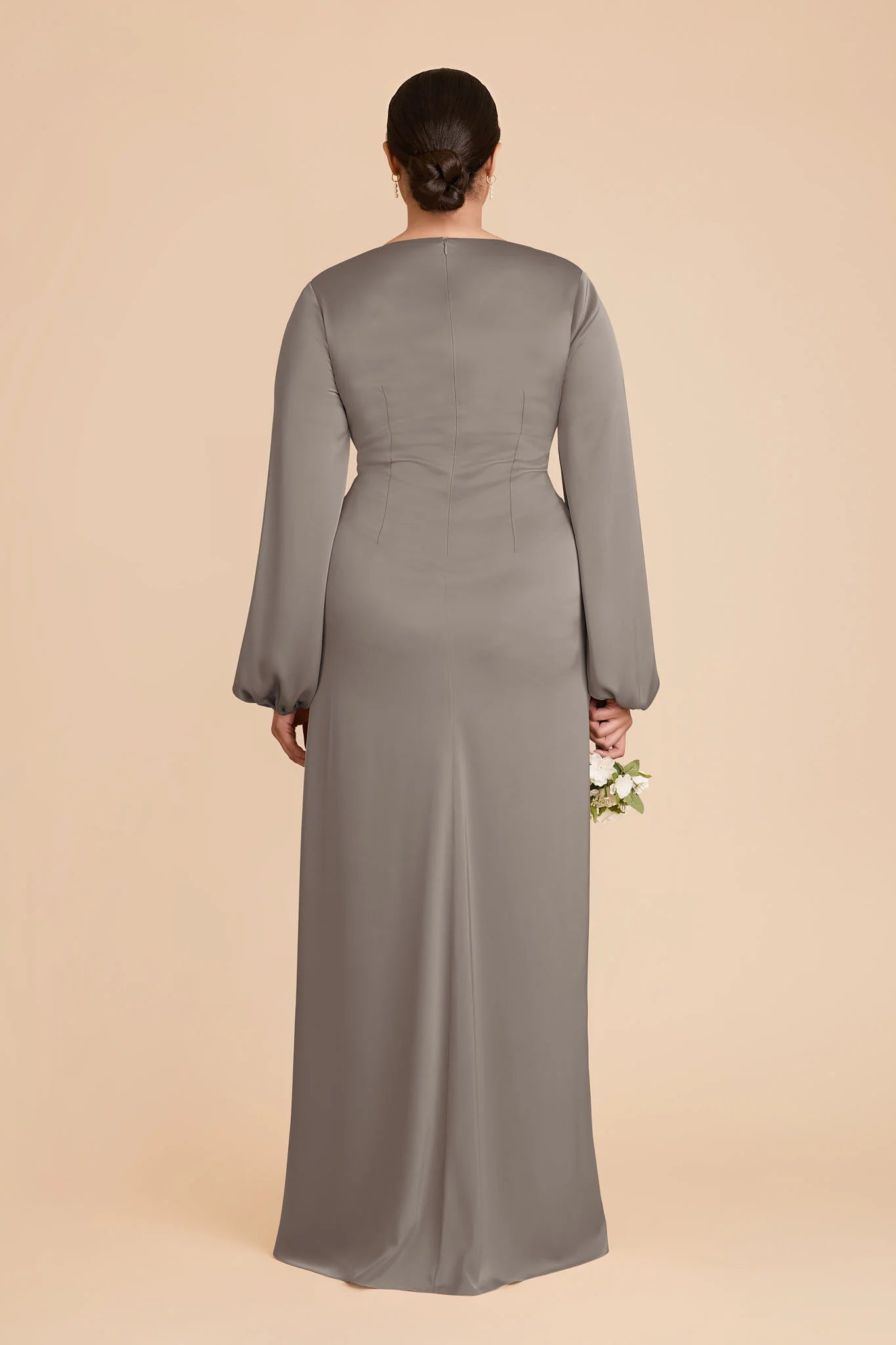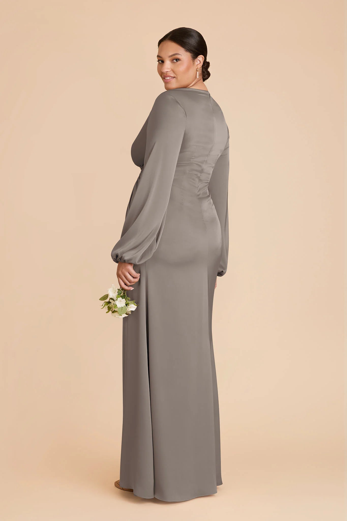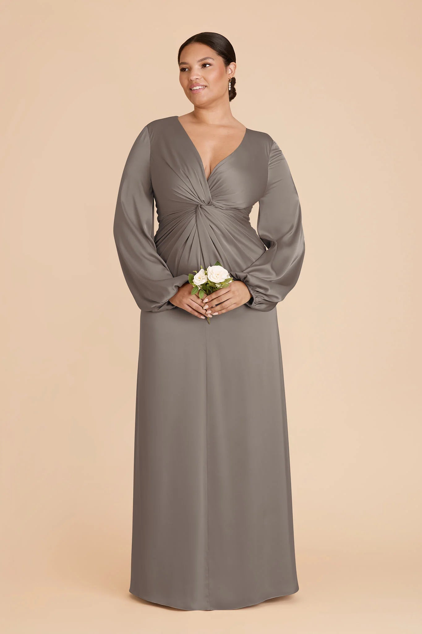 Make a statement in this long-sleeve, matte satin bridesmaid dress with a plunging V-neck, a flattering knotted waist.
