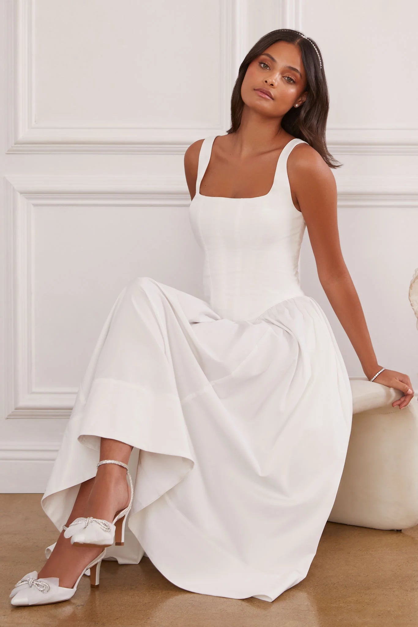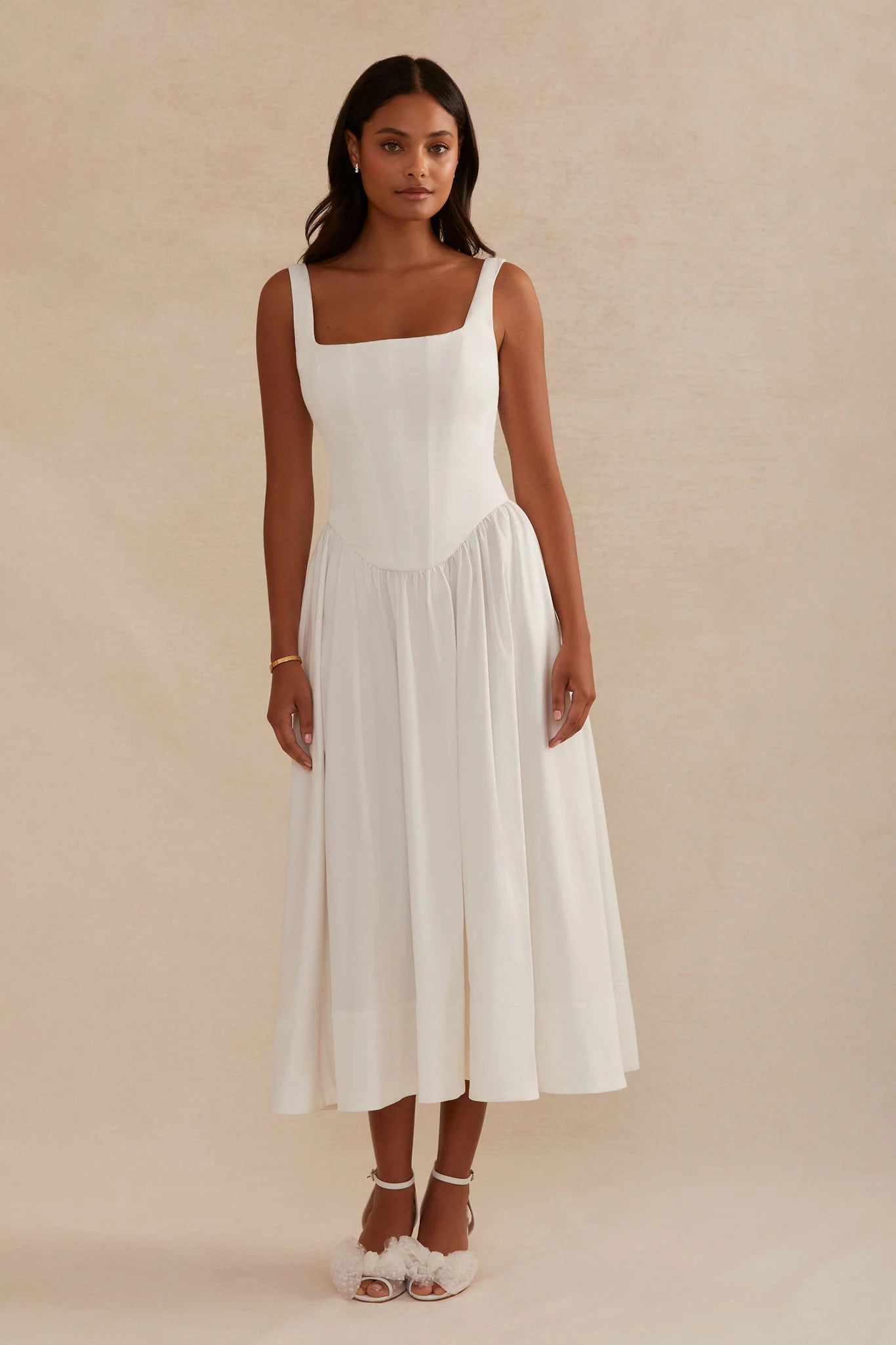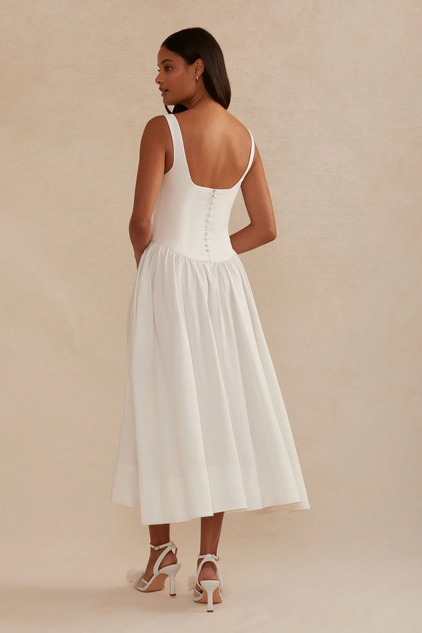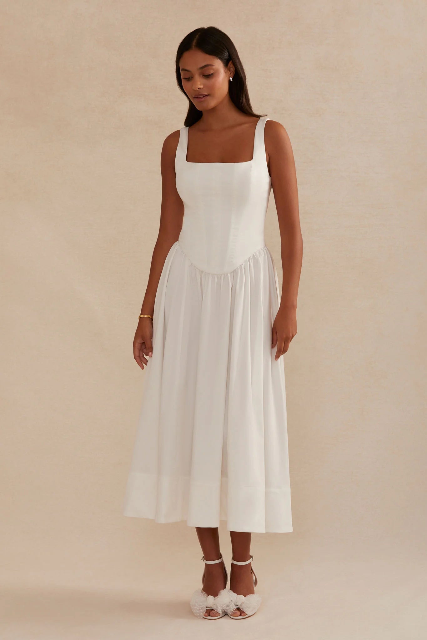 This drop waist corset dress with a sweeping skirt makes a statement.