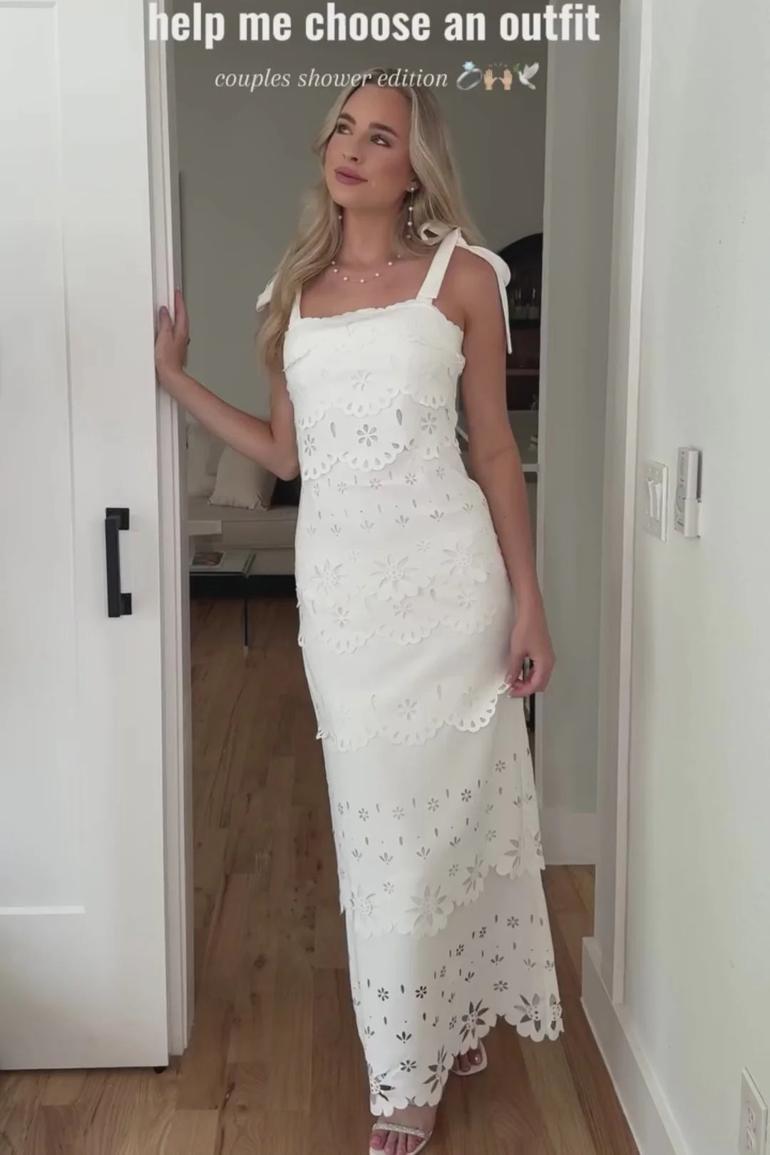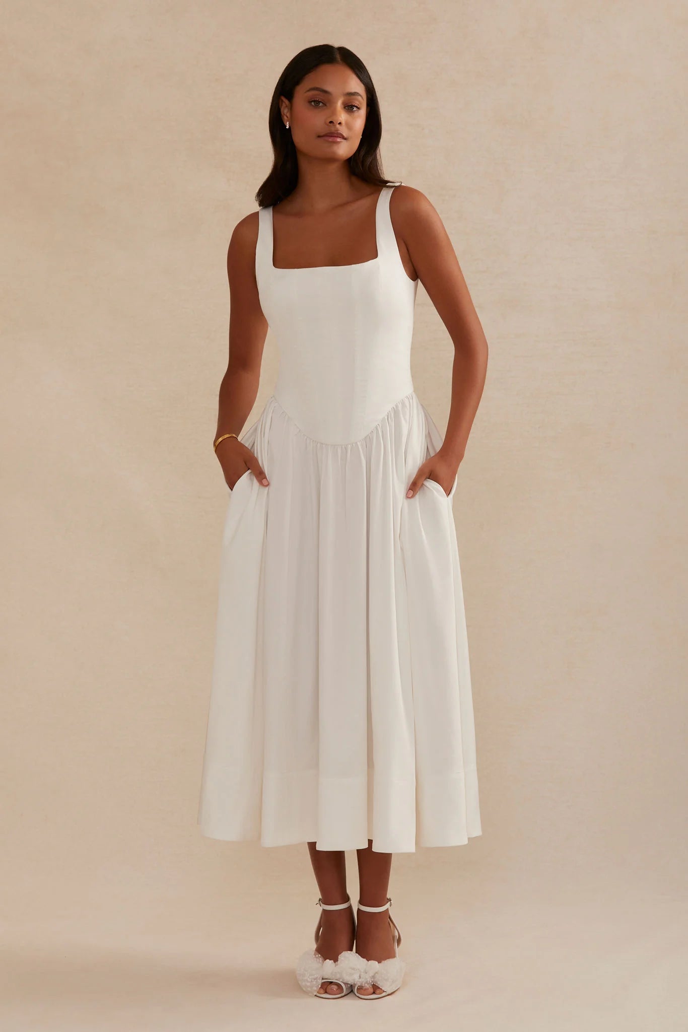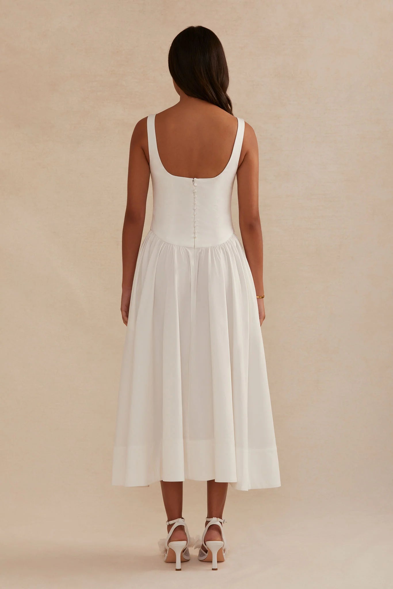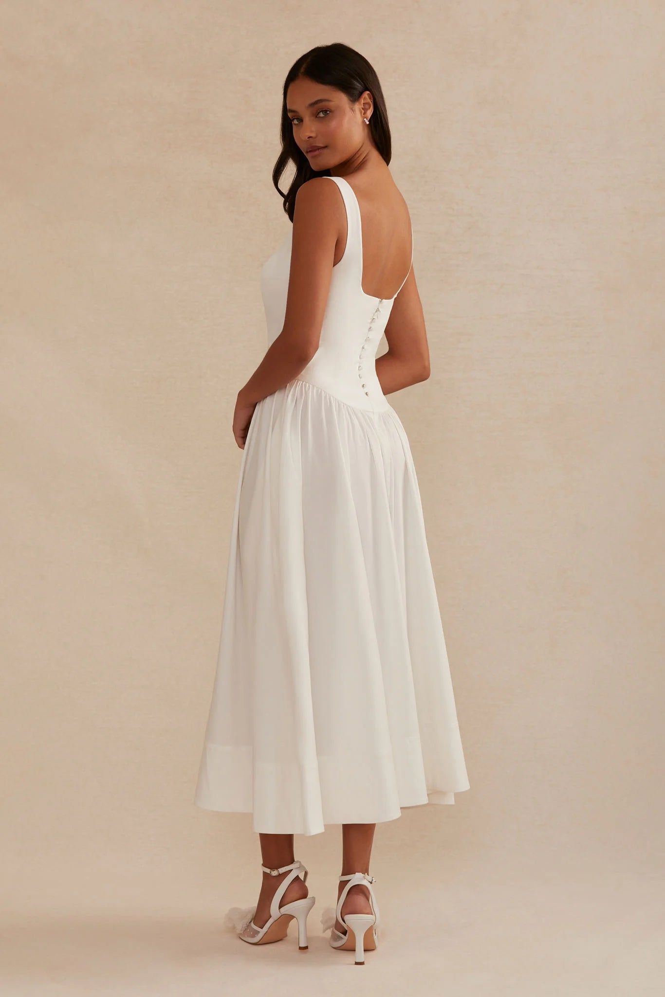 This drop waist corset dress with a sweeping skirt makes a statement.