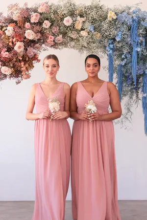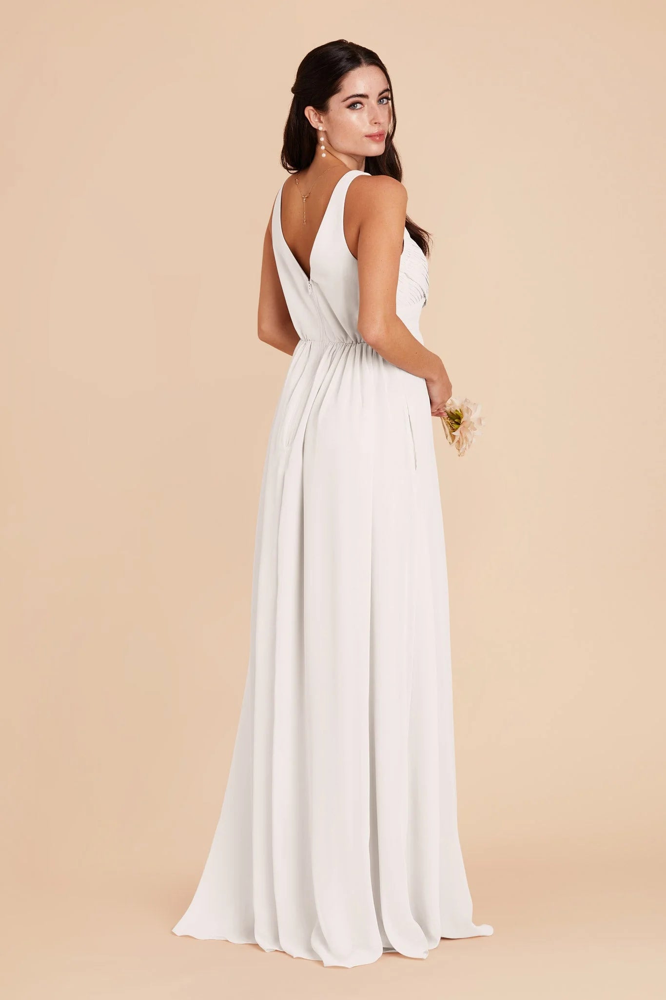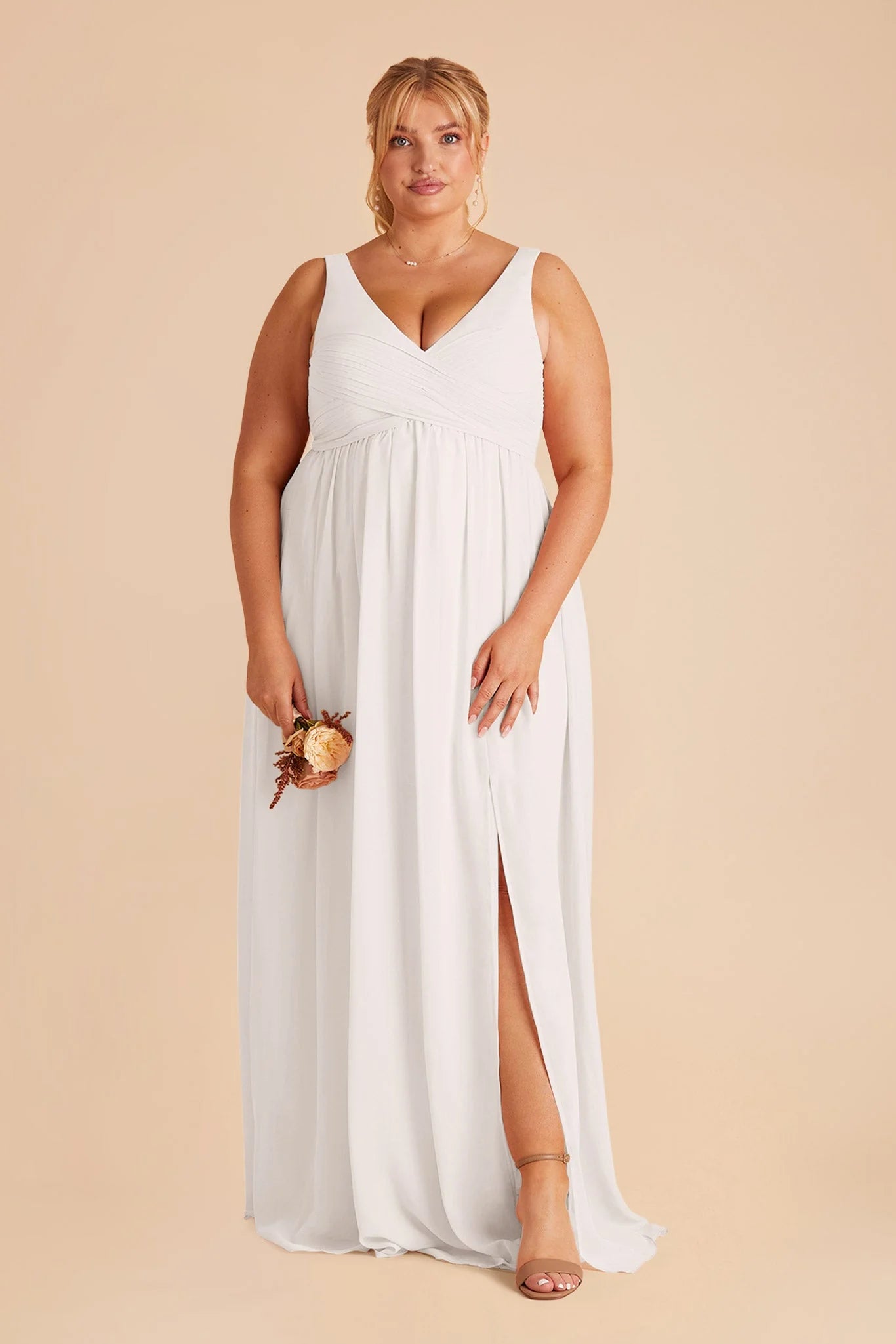 A soft and airy sleeveless bridesmaid dress with an empire waist that can easily double as a maternity dress.