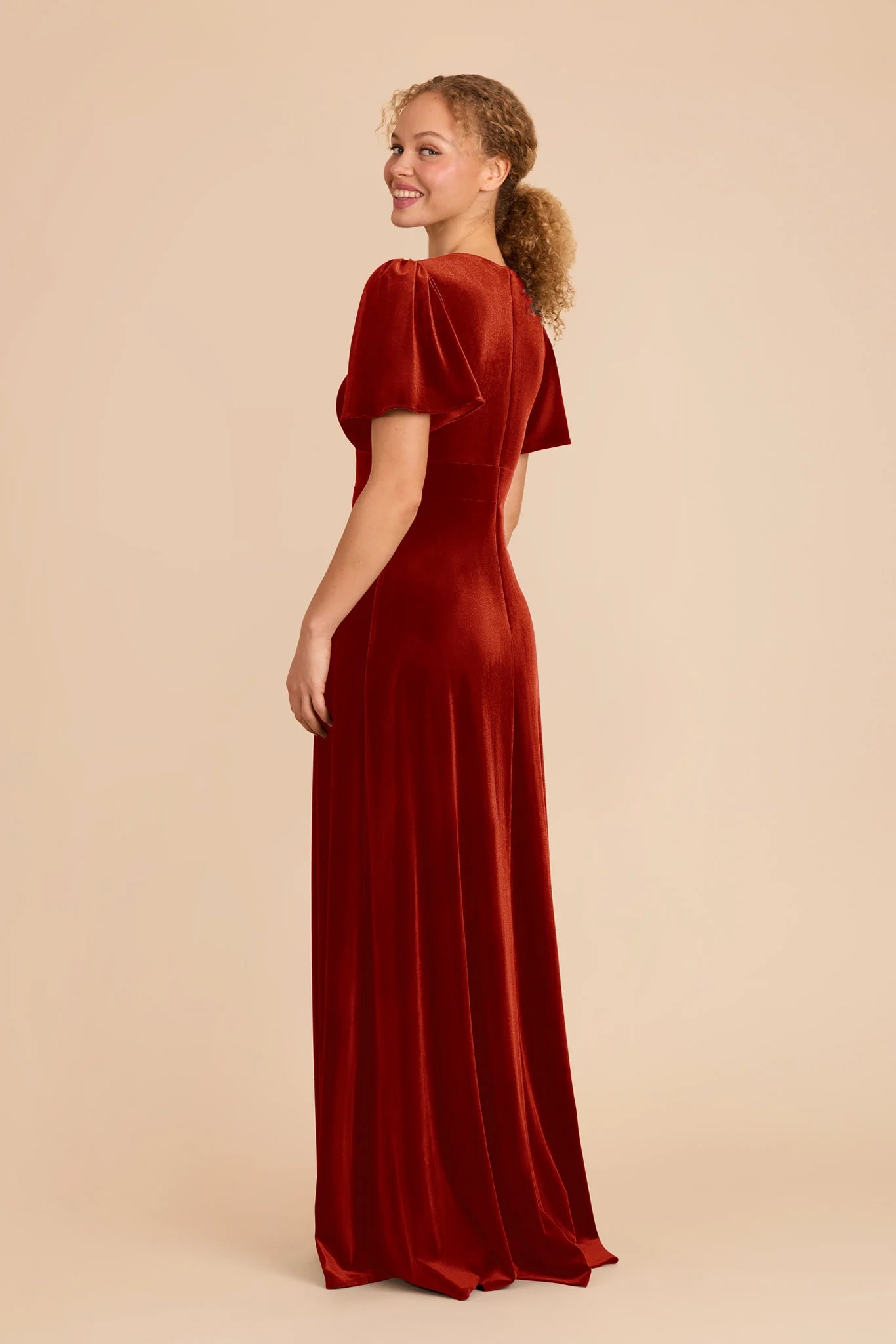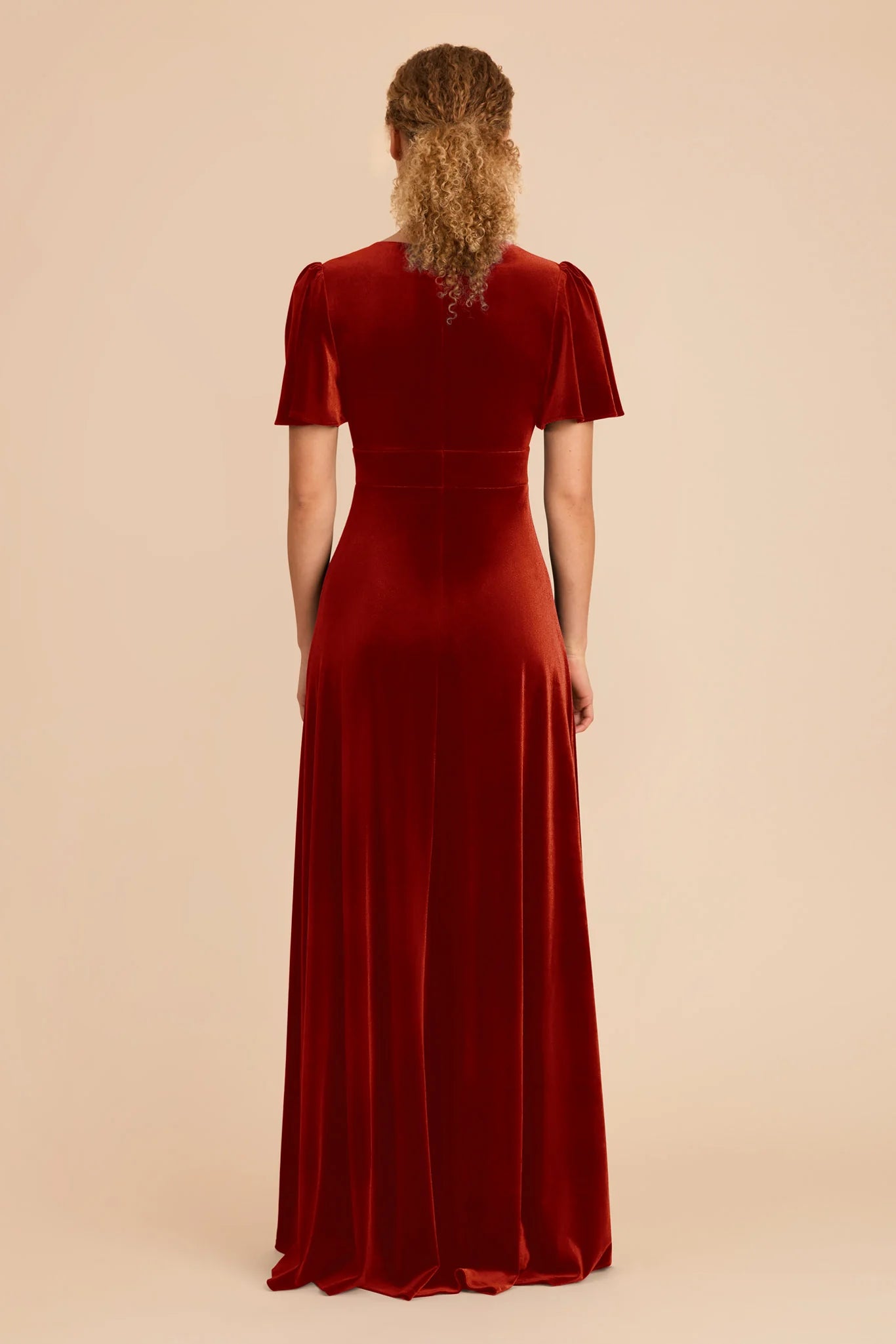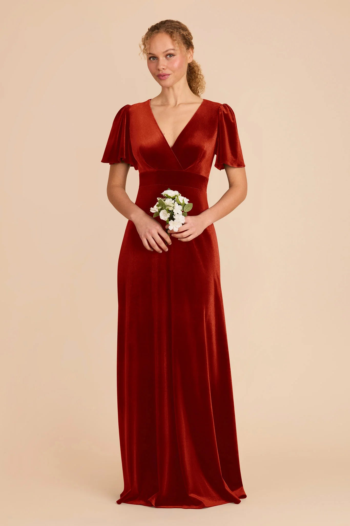 An A-line bridesmaid gown with a V-neck and flutter sleeves for an ethereal feel.