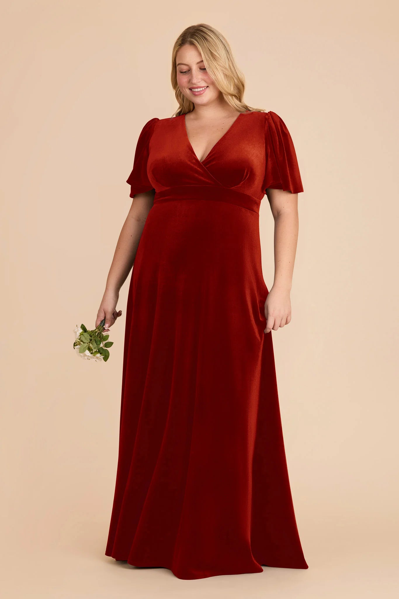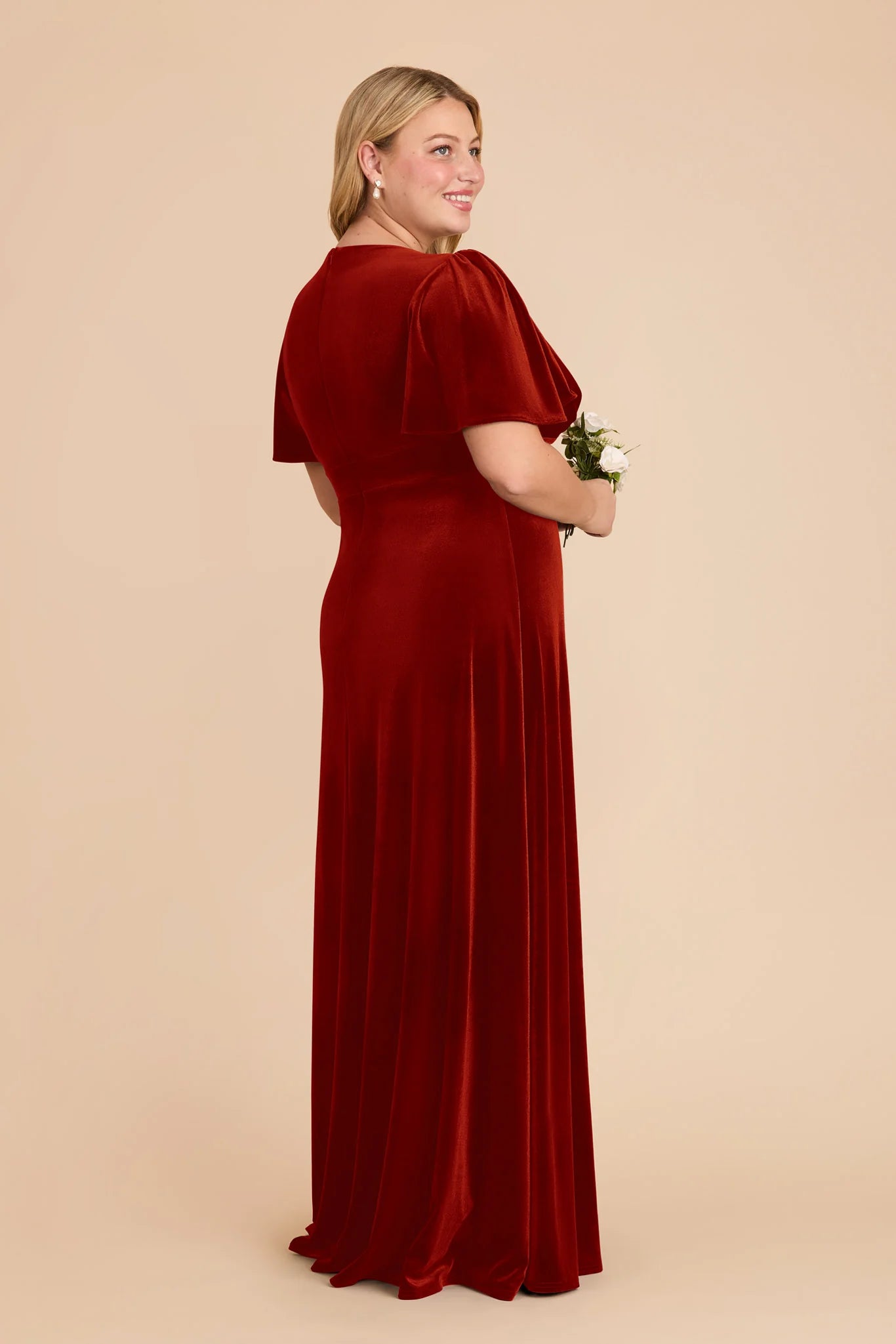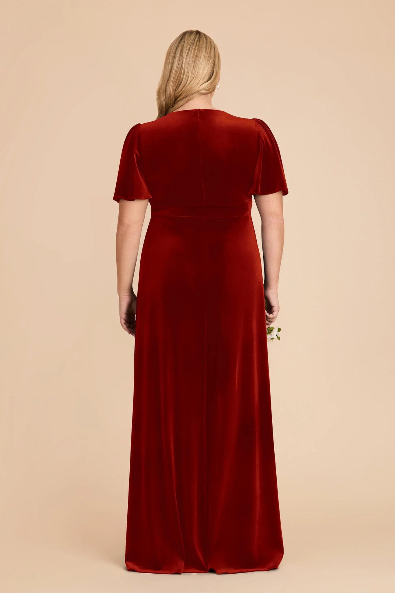 An A-line bridesmaid gown with a V-neck and flutter sleeves for an ethereal feel.
