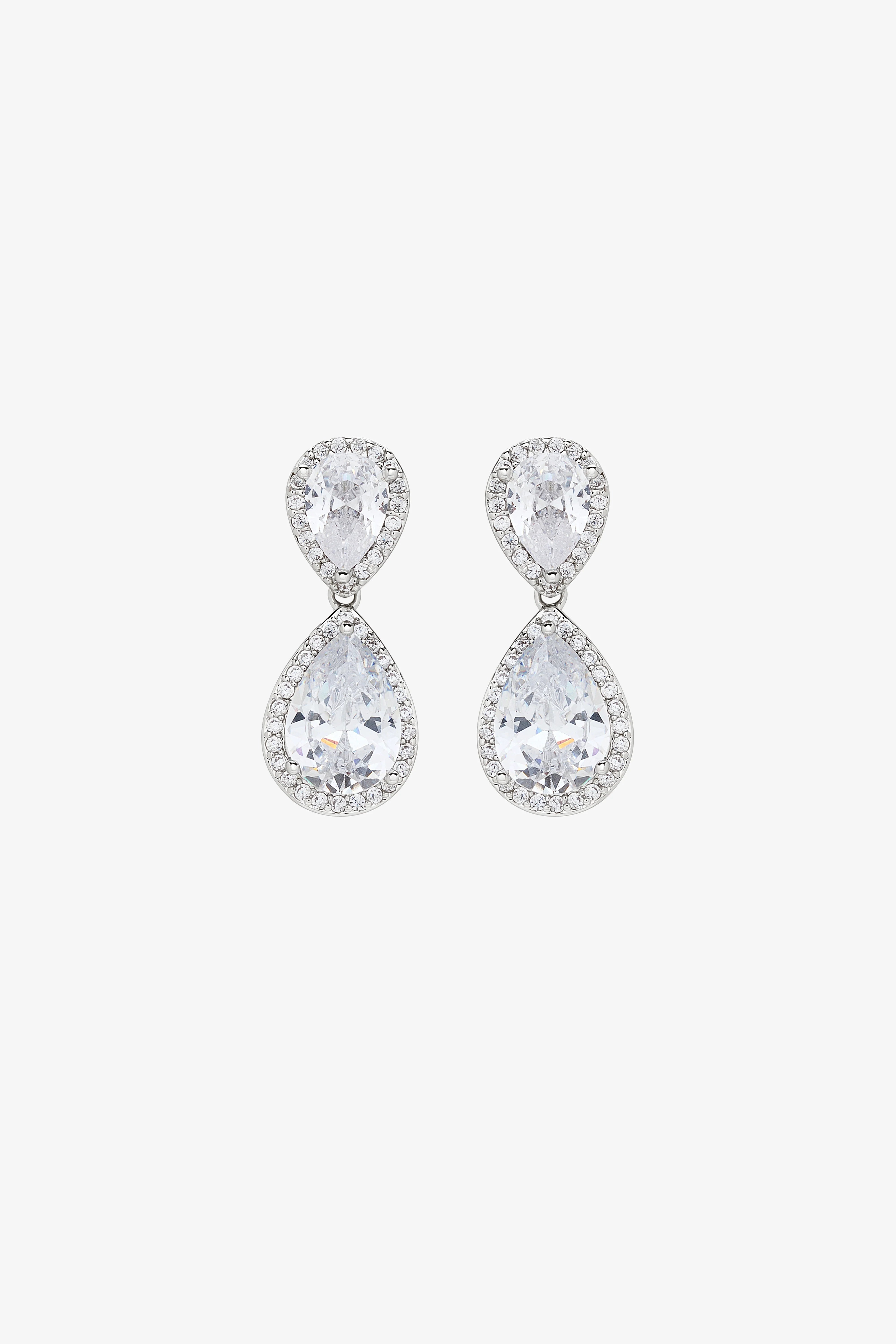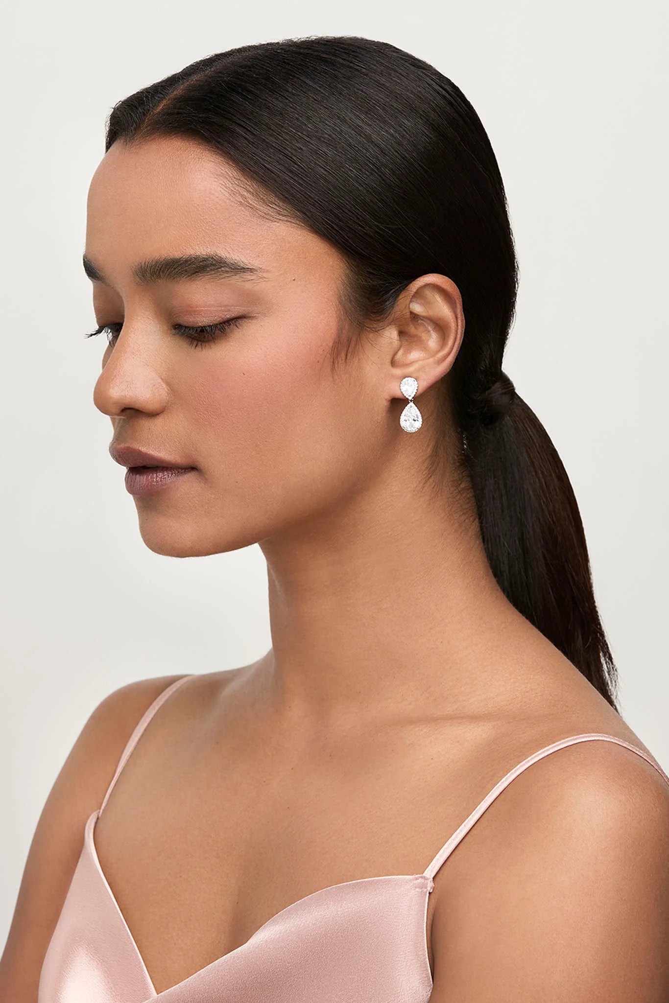 You'll shine bright with these earrings. They feature pavé-set halos and clear glass teardrops, the perfect addition for a beautiful wedding.