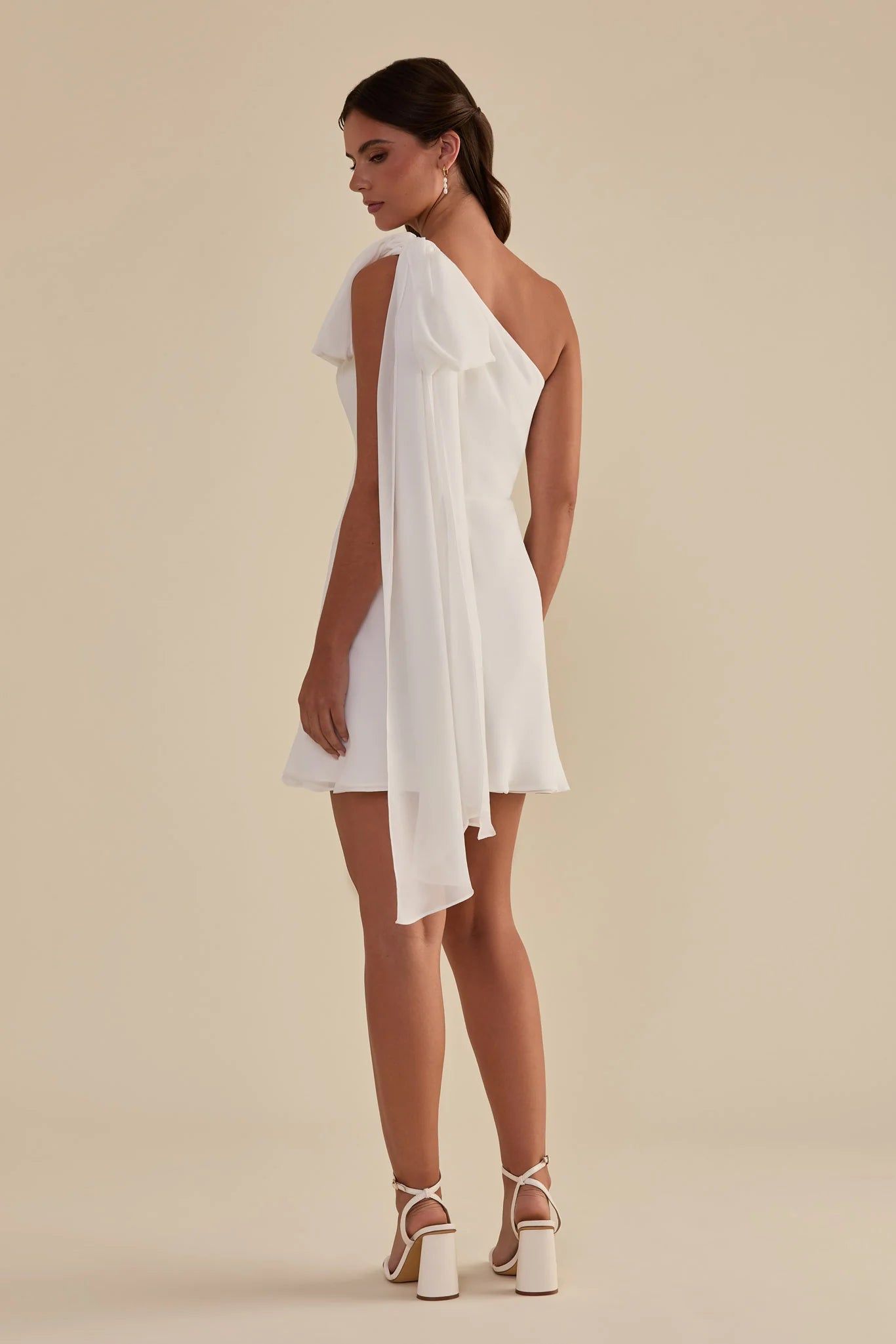 The gorgeous train on this white mini dress can be styled in a myriad of ways.