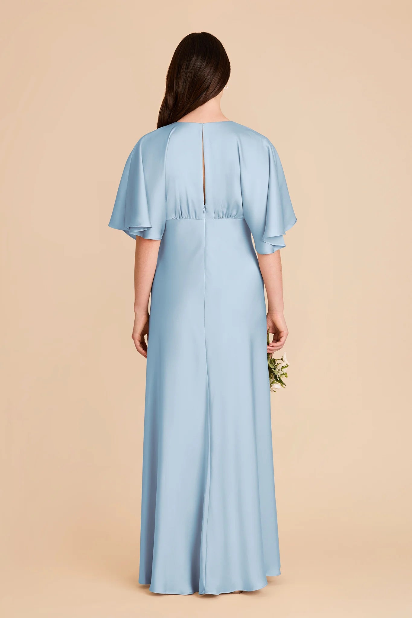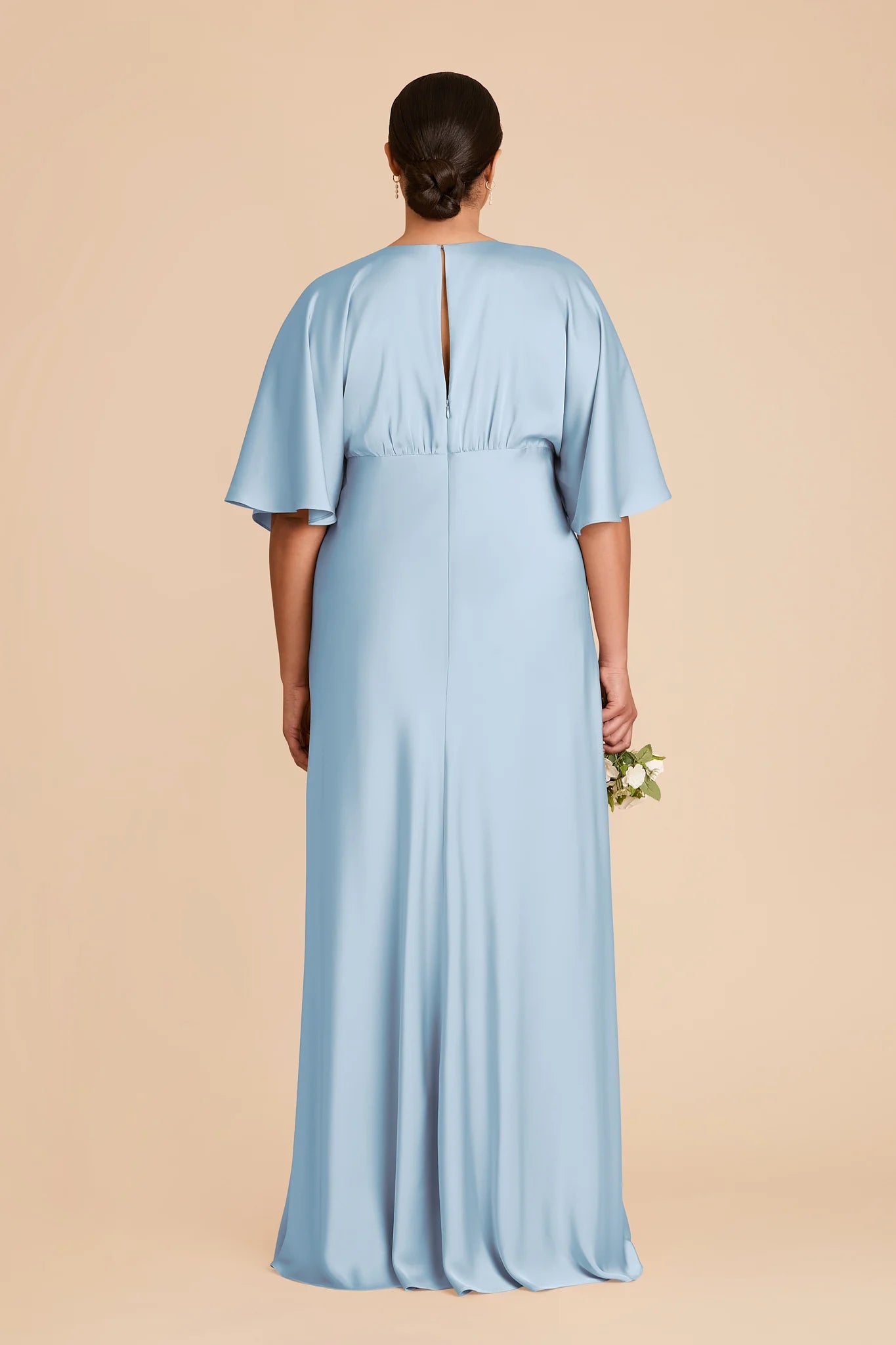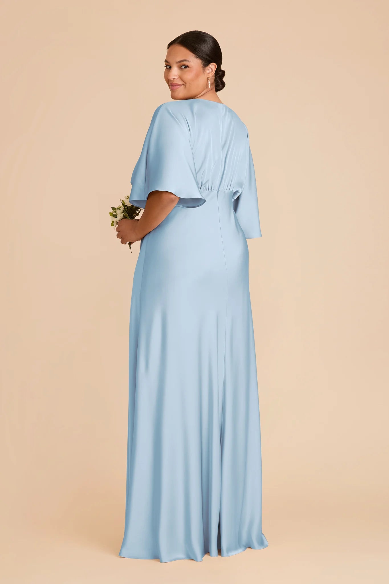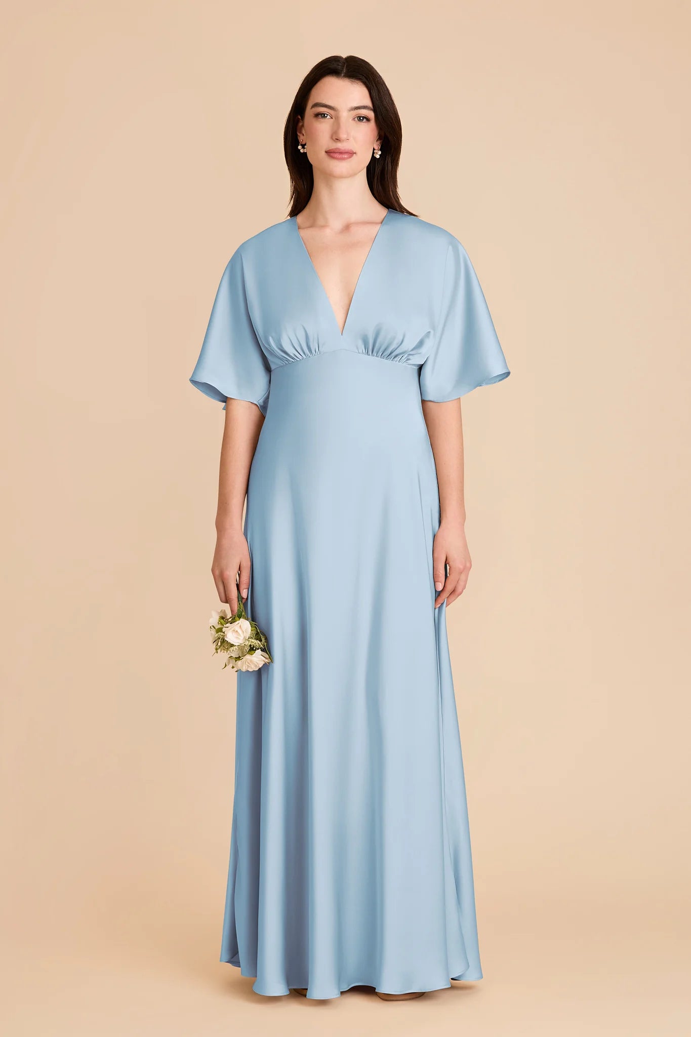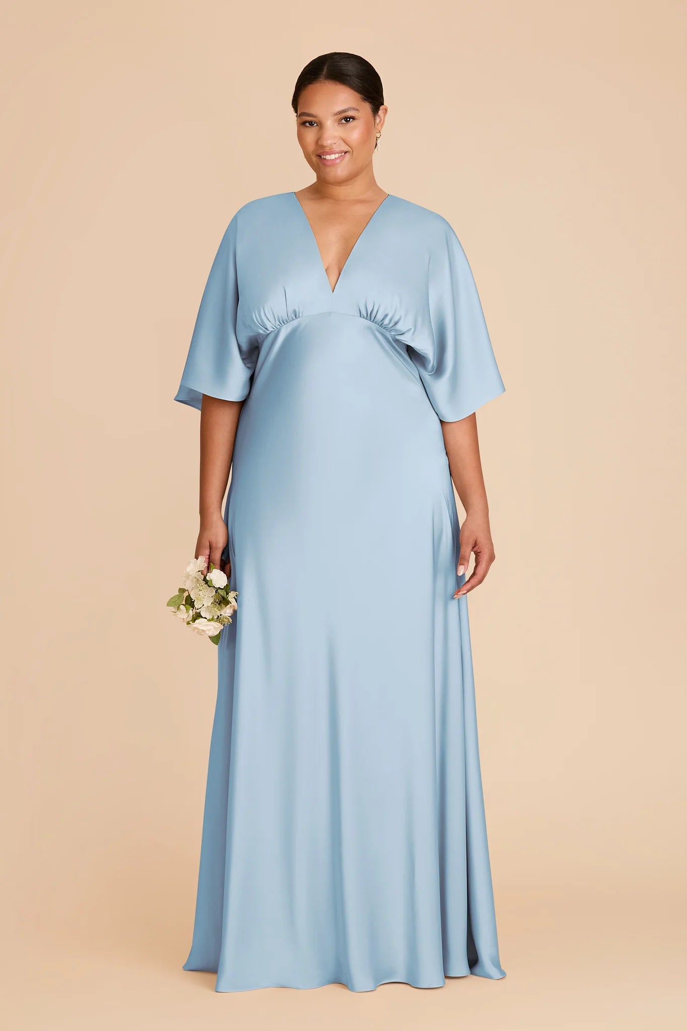 Modern sophistication meets timeless elegance in this floor-length gown—featuring a V-neck, kimono sleeves and a leg slit.