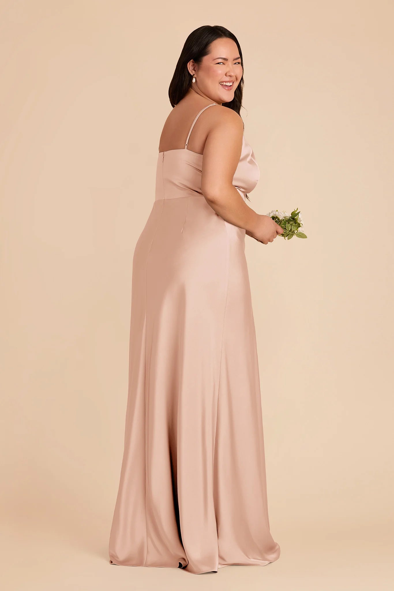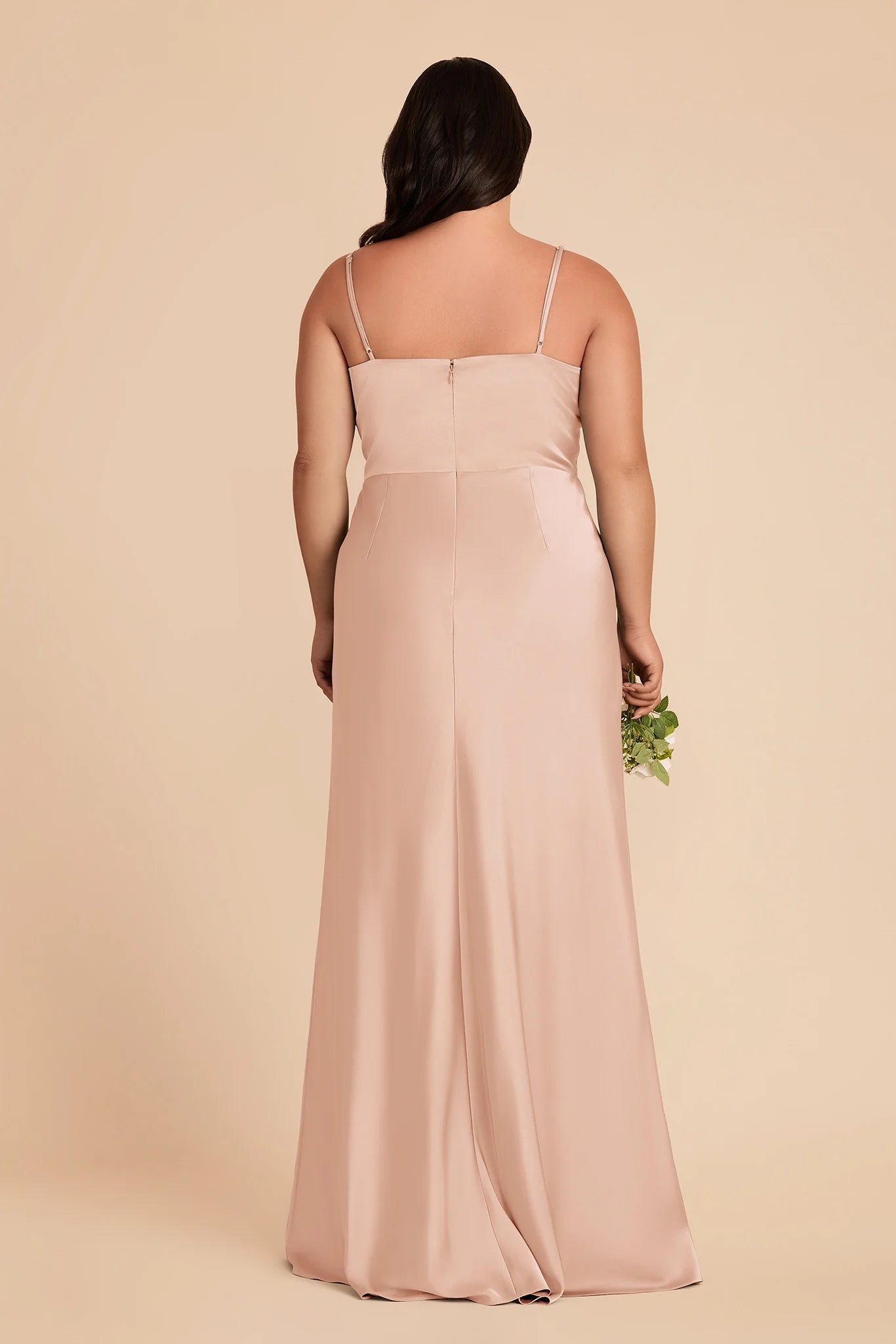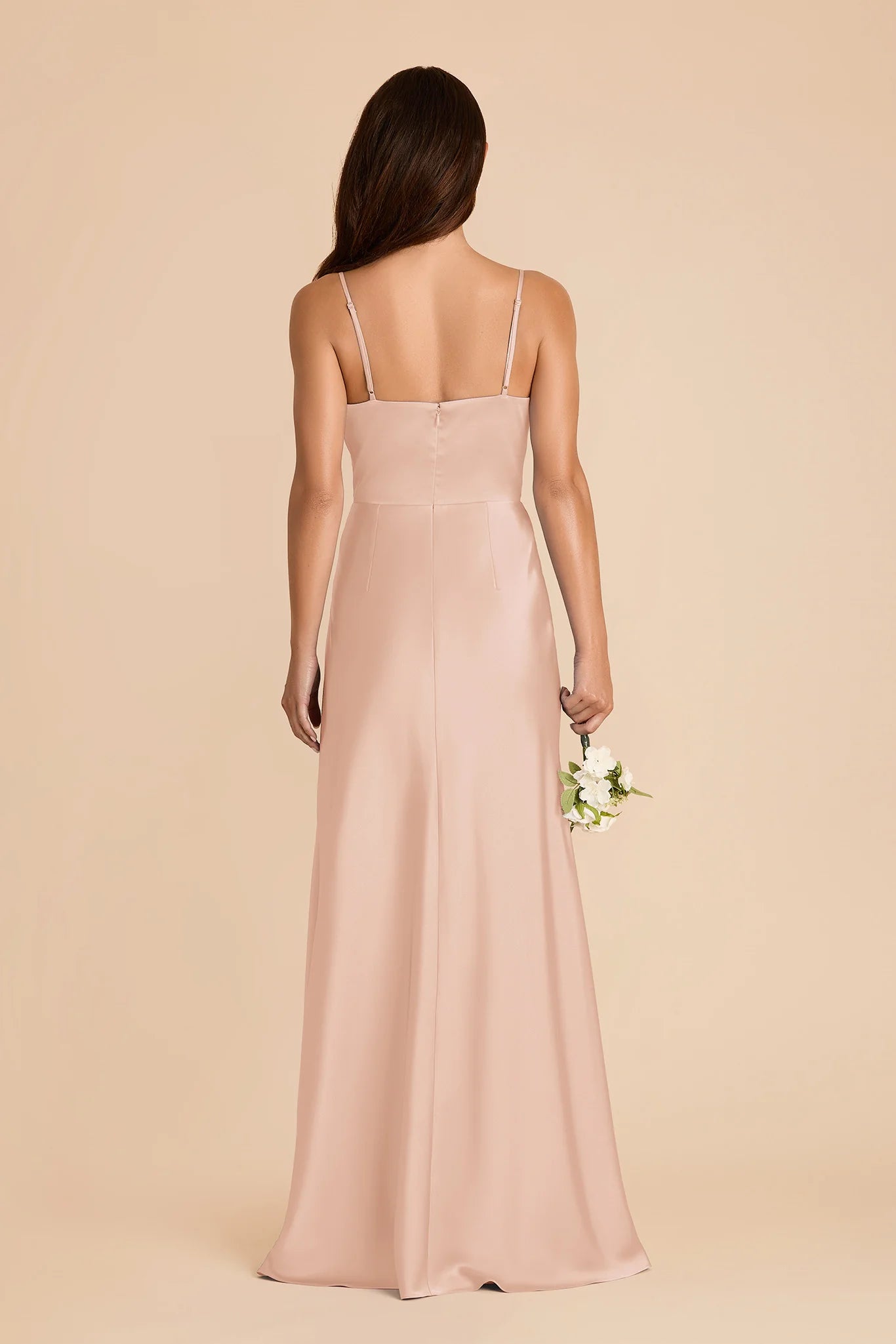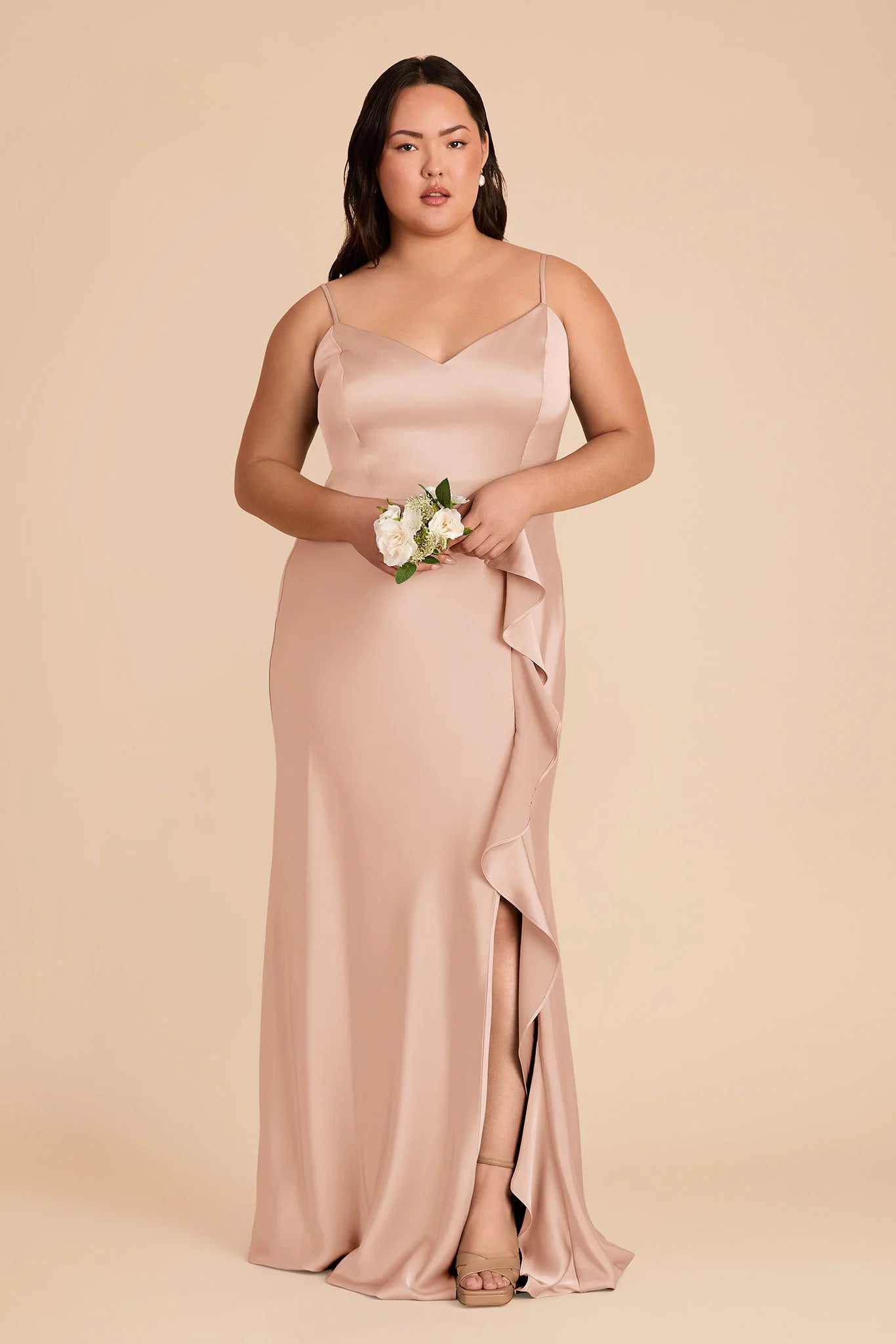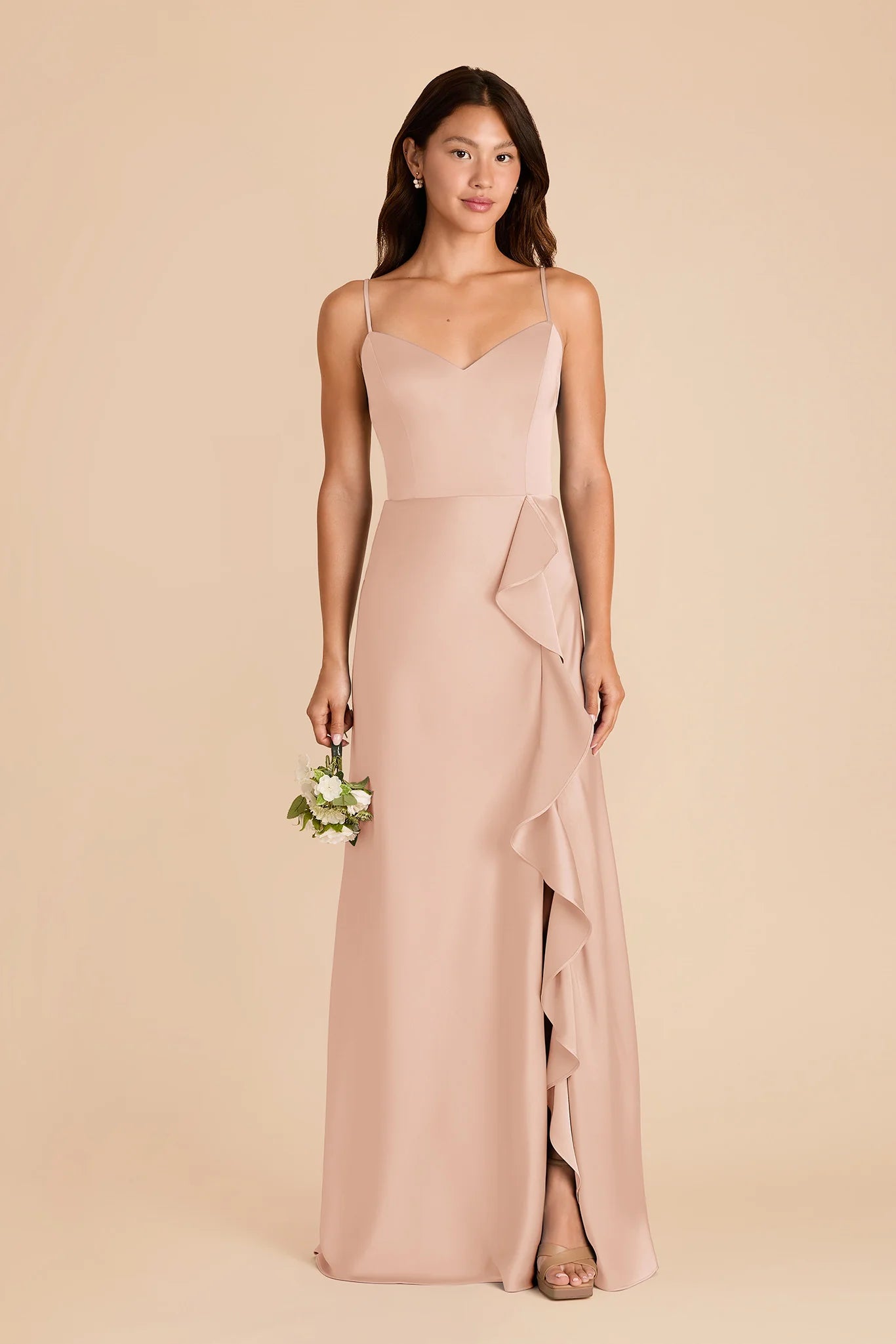 Show a little leg in matte satin bridesmaid dress with a dramatic cascade ruffle slit and thin, convertible straps.