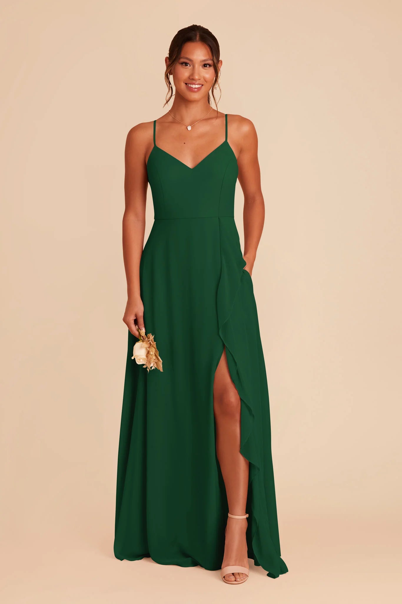 Show a little leg in an airy chiffon bridesmaid dress with a dramatic cascade ruffle slit and thin, convertible straps.