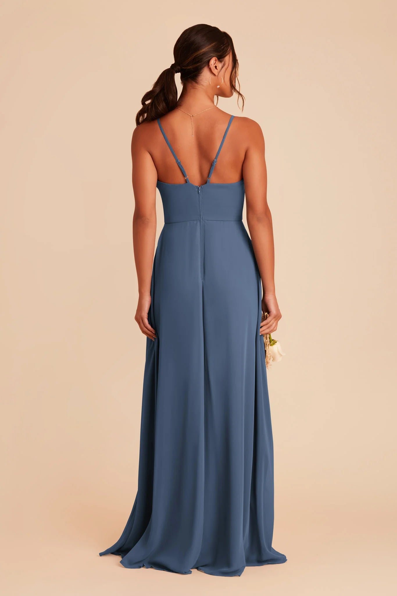 Show a little leg in an airy chiffon bridesmaid dress with a dramatic cascade ruffle slit and thin, convertible straps.