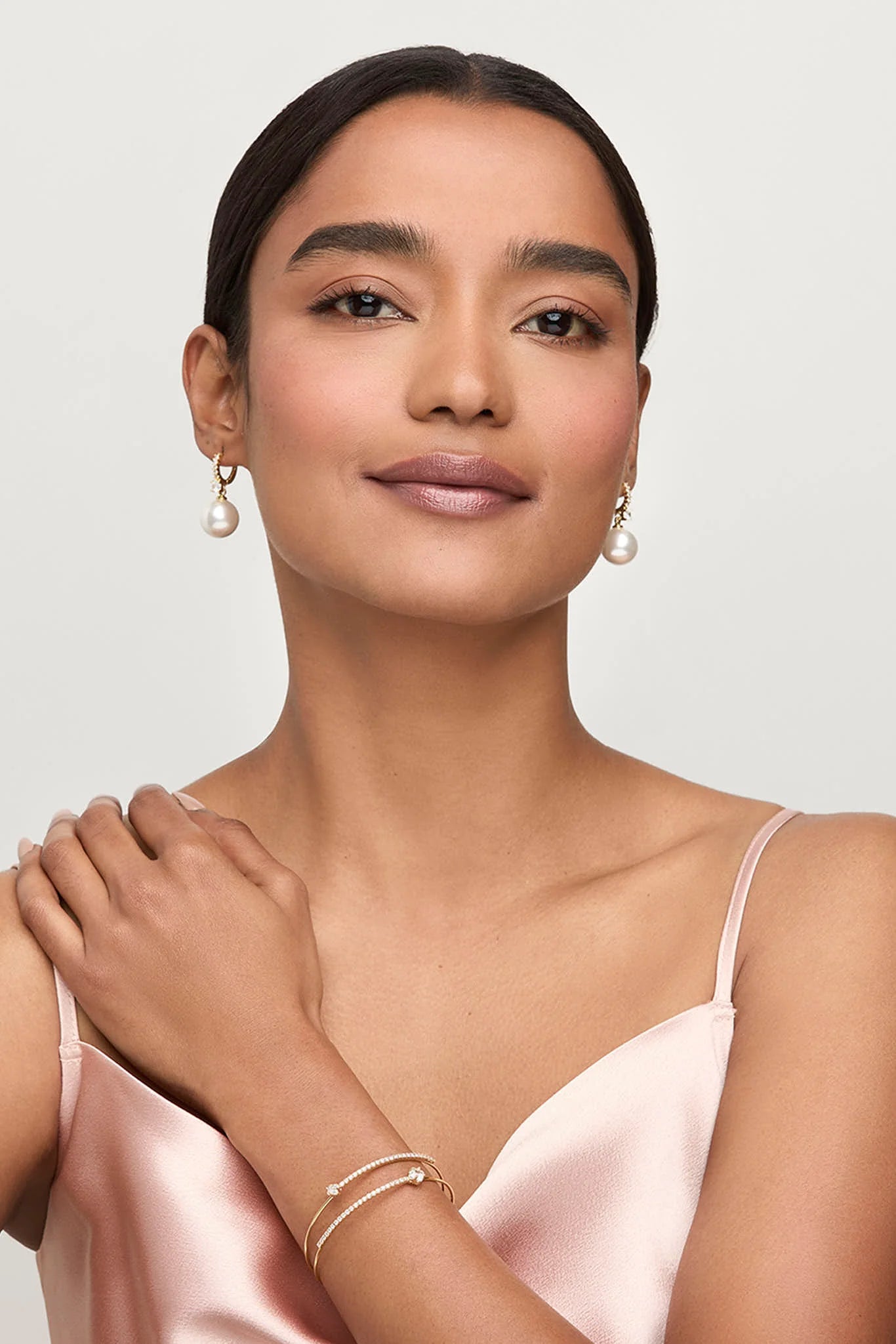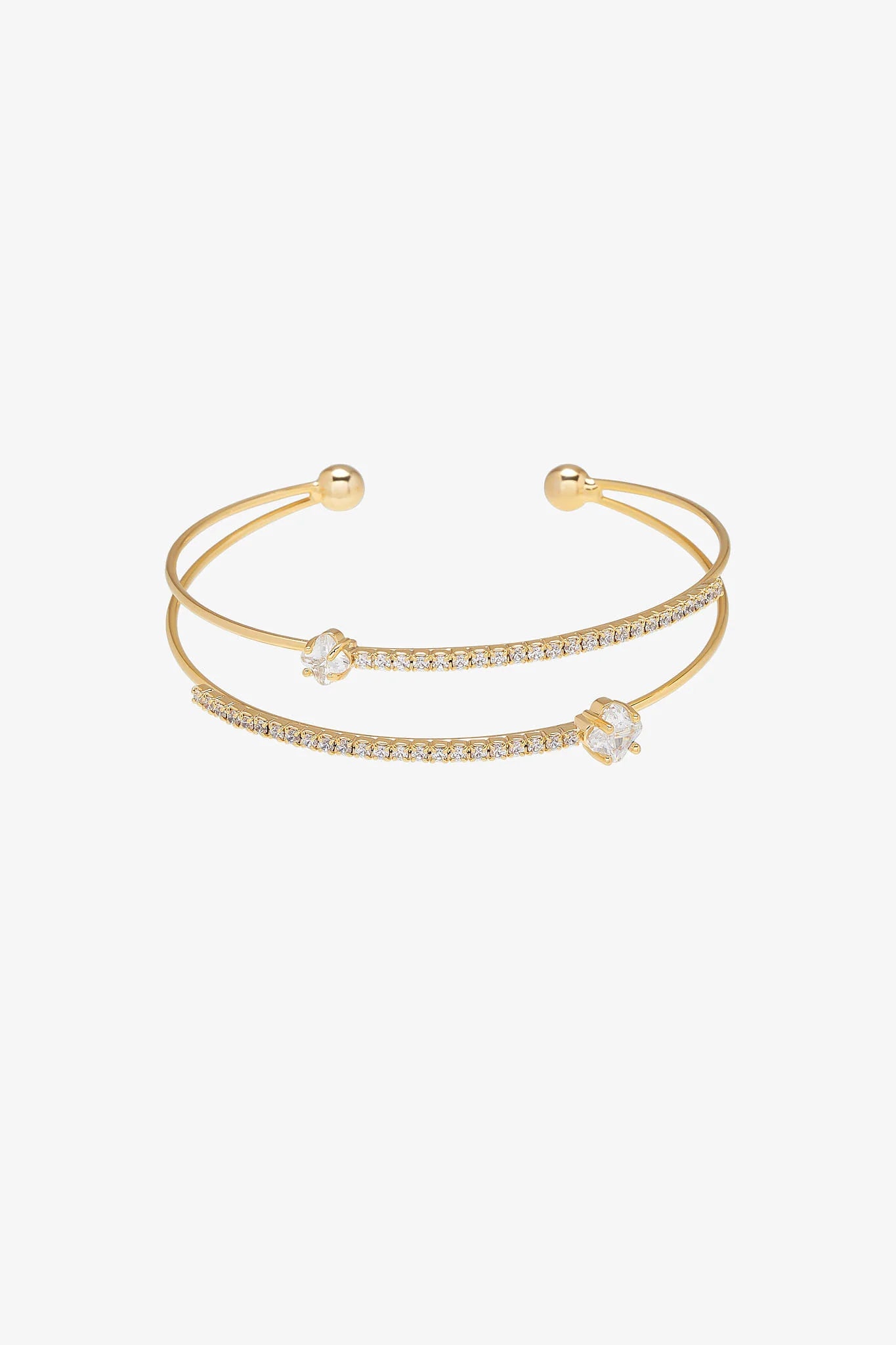 The double-layered cuff bracelet's graceful curves are accentuated with a continuous line of tiny gemstones and floral-shaped accents.