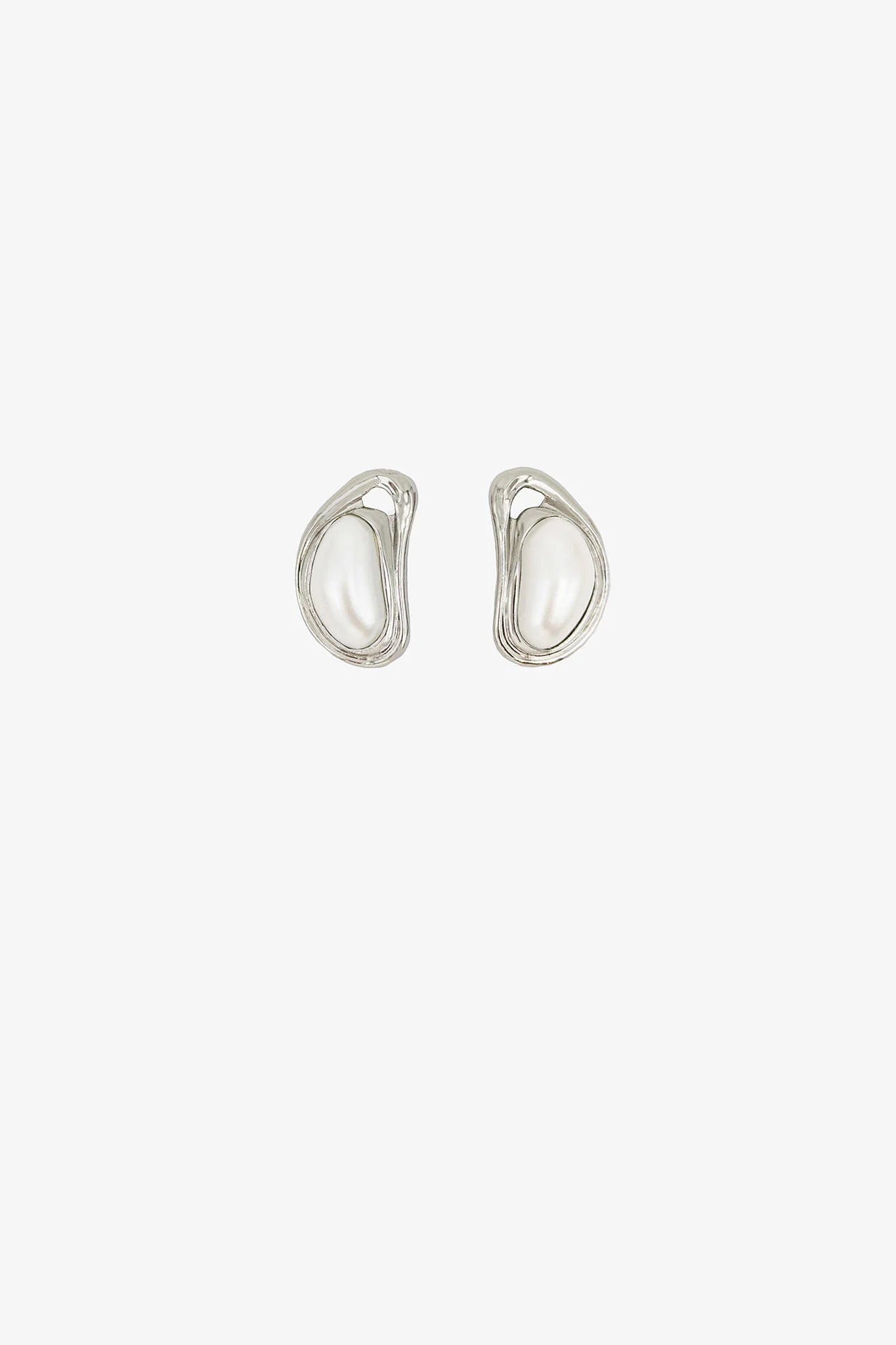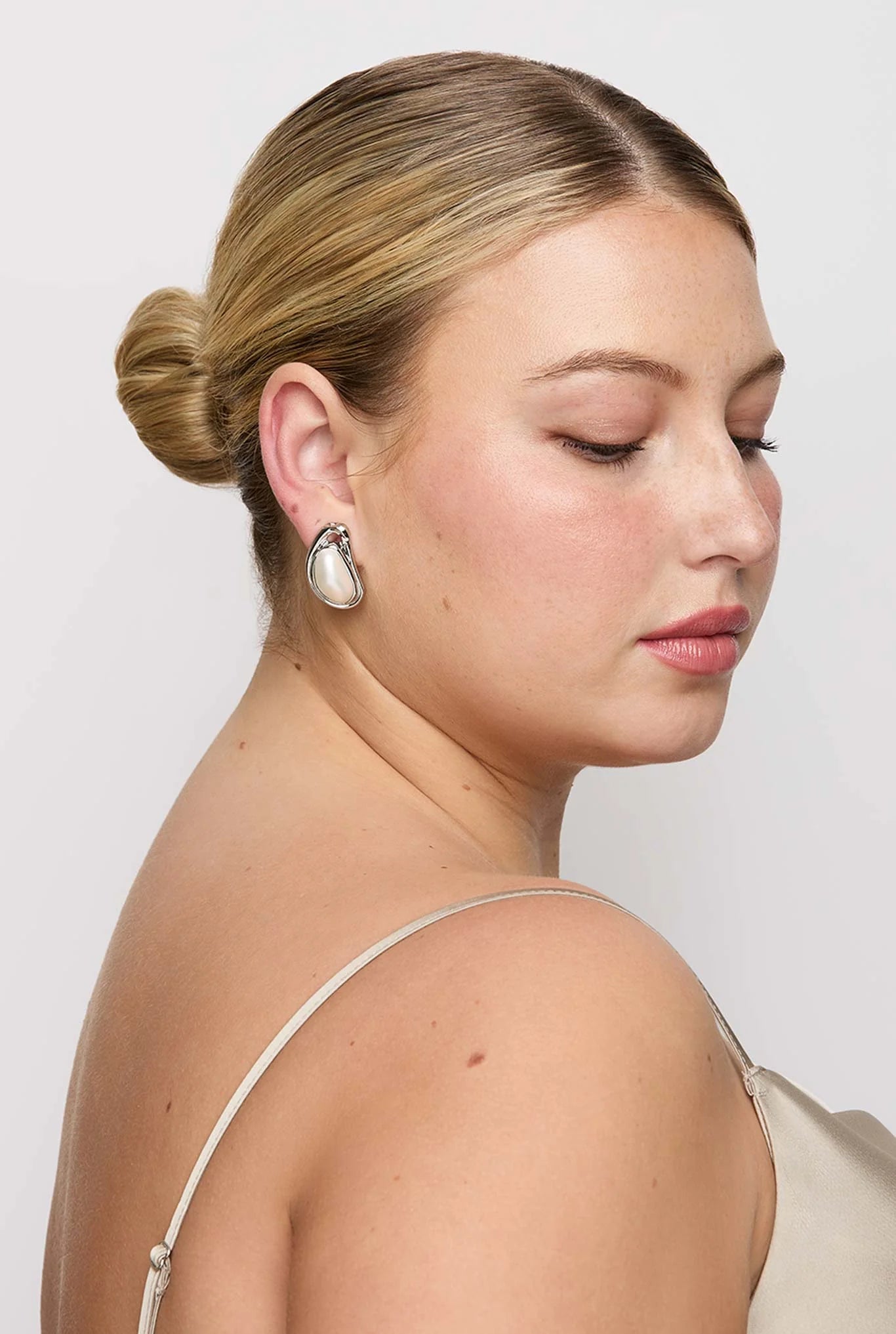Choose earrings with an organic frame and luminous pearl center for a bold bridesmaid look.