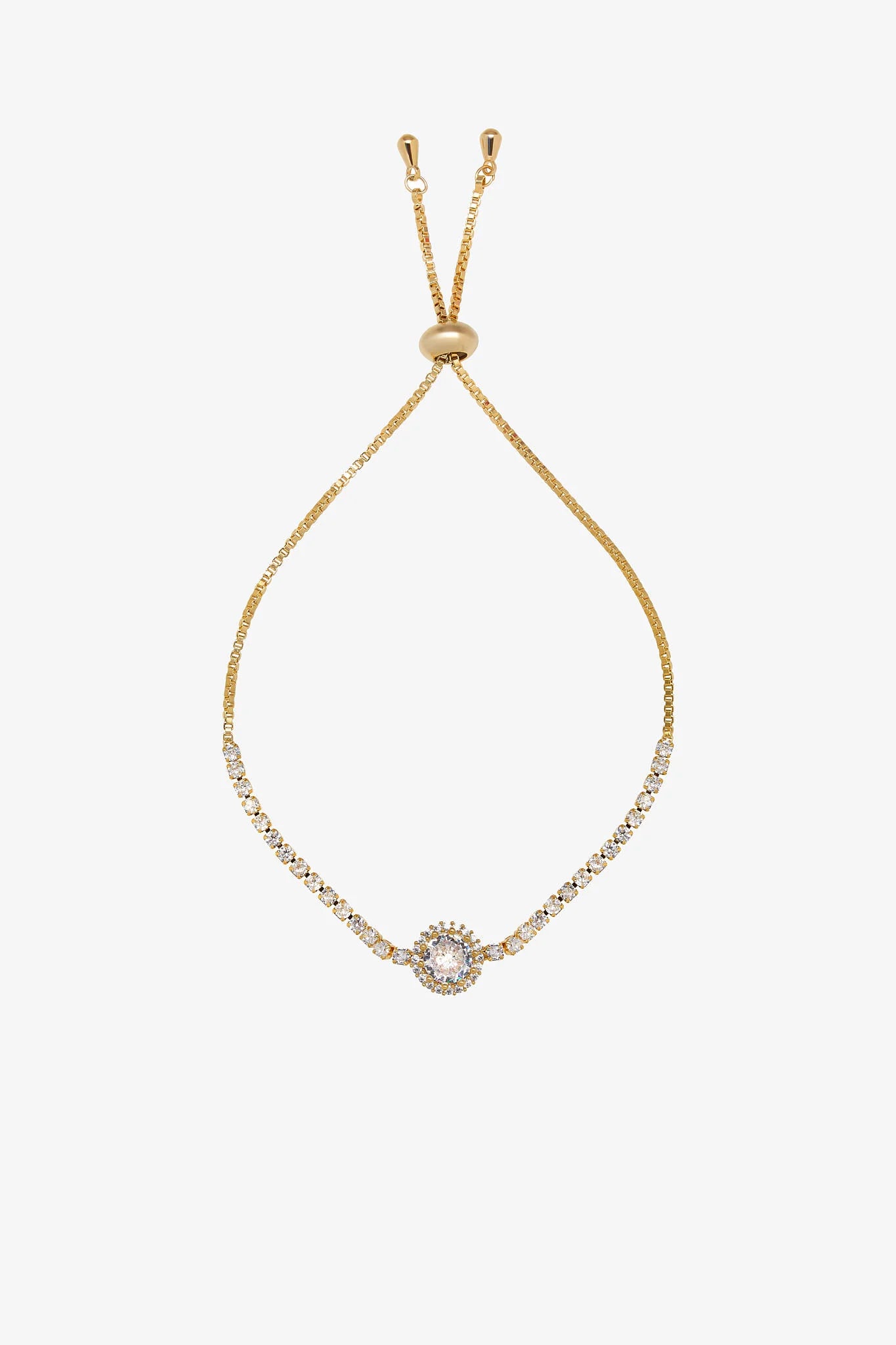 This pavé circle bracelet showcases a central halo of tiny gemstones that draws attention.