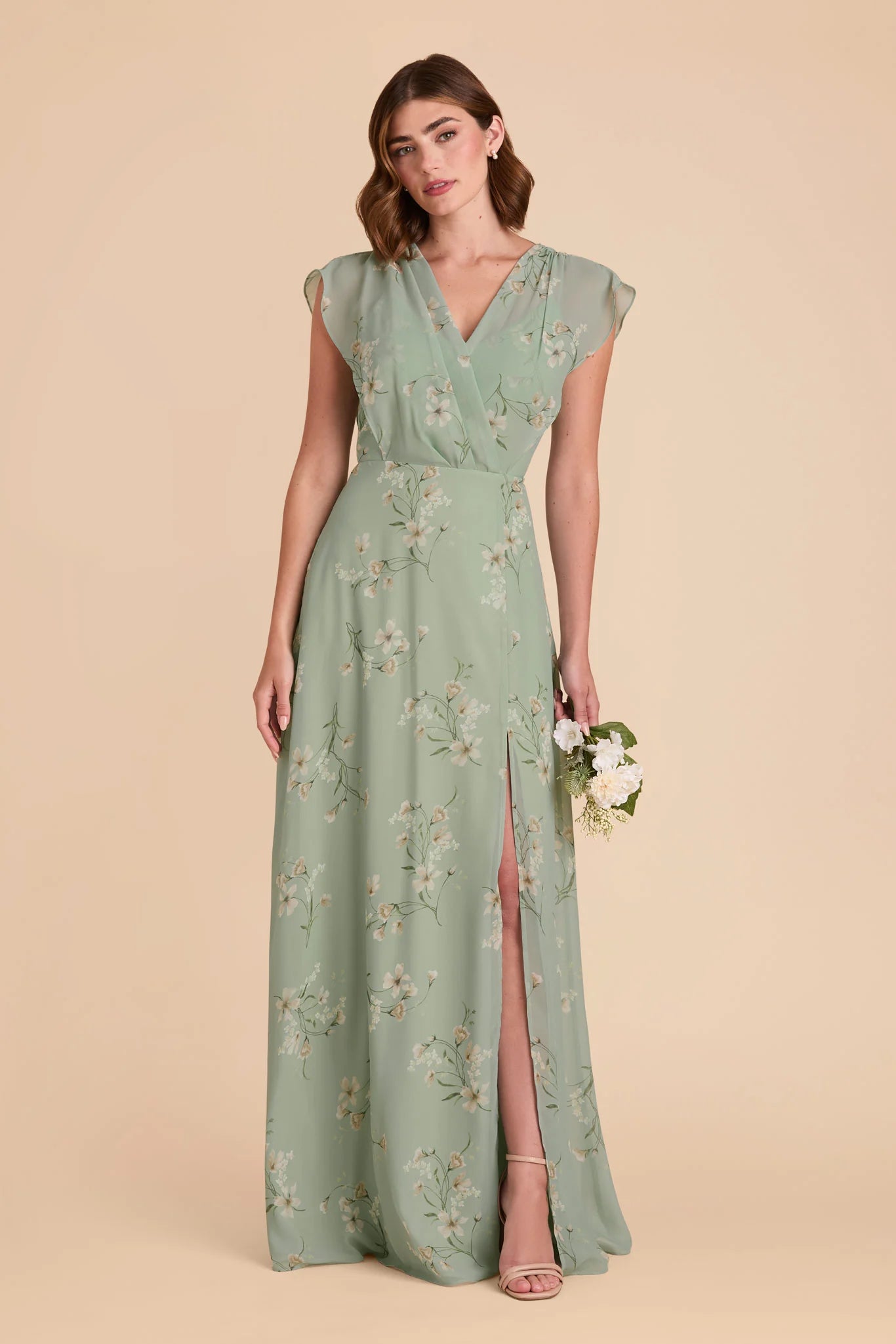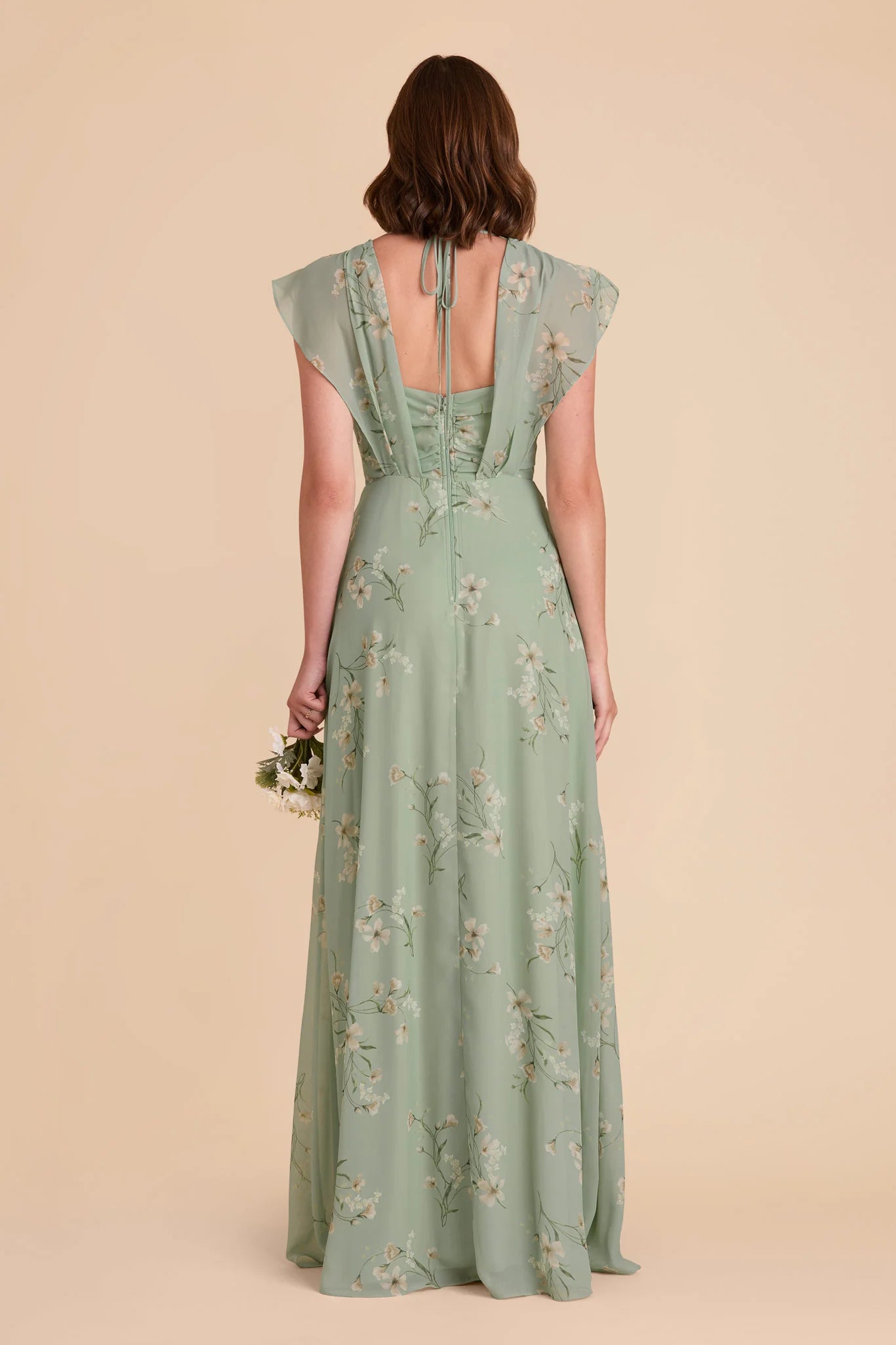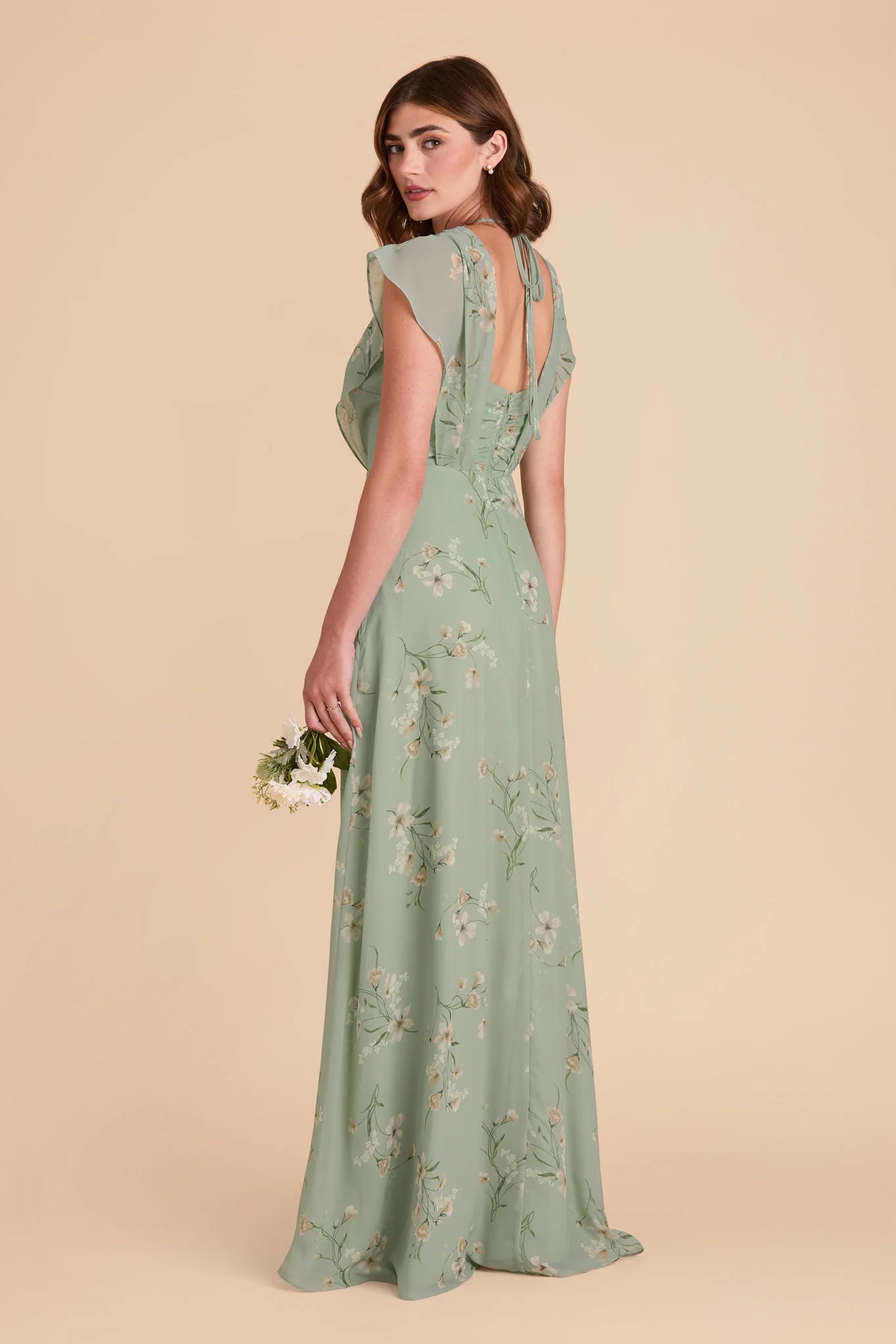 An A-line floor-length chiffon gown with ruffled sleeves that is sure to turn heads.