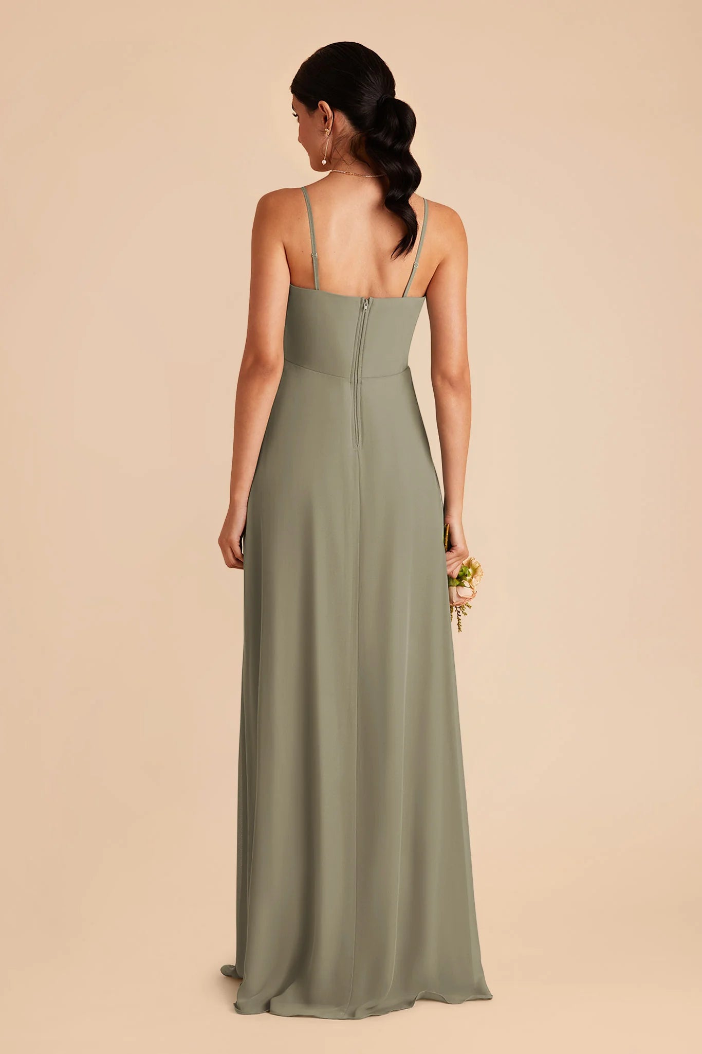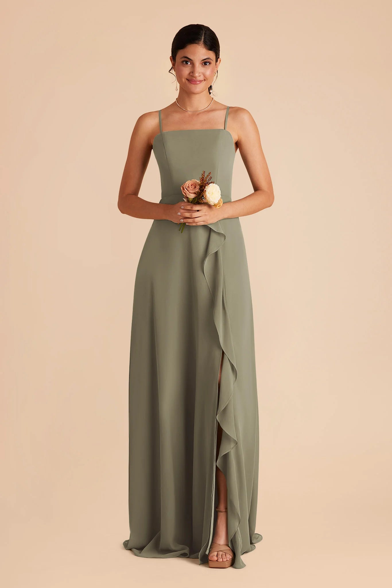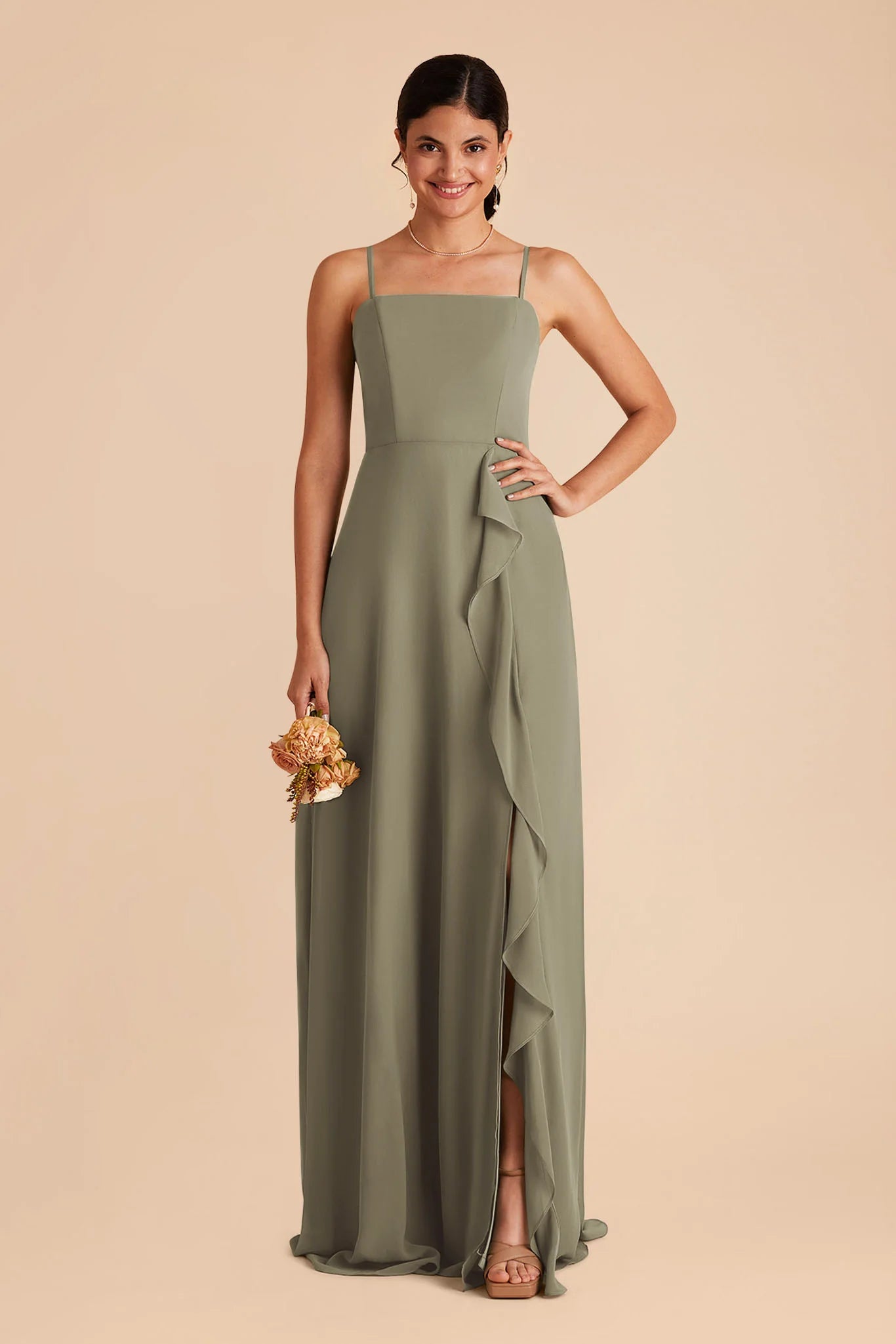 With versatility in mind, this convertible bridesmaid dress offers a ruffled skirt and removable spaghetti straps.
